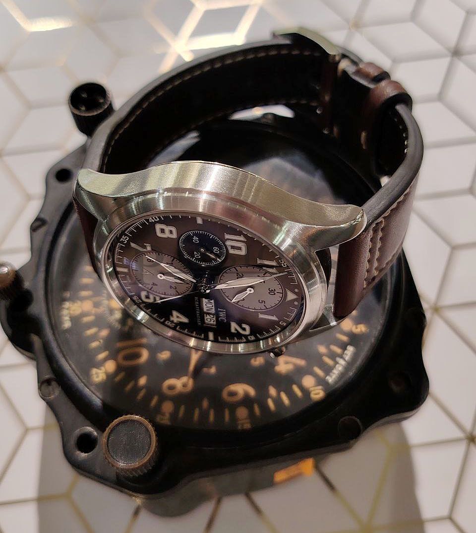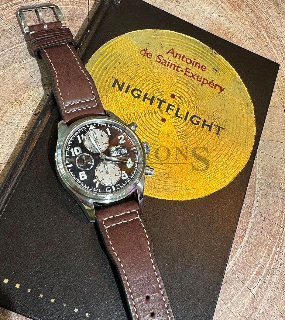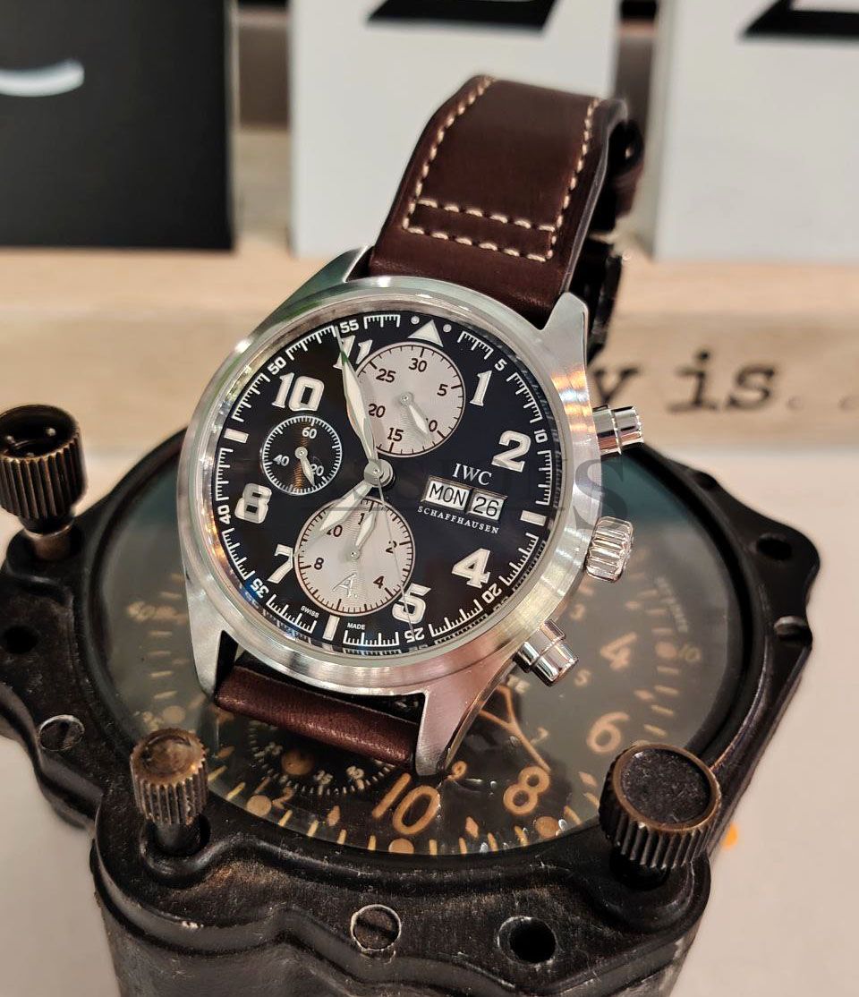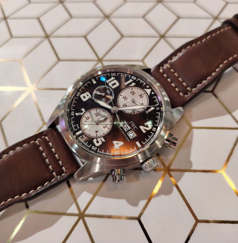 The pilot chronograph is best exemplified by IWC with their long history associated with military and aviation. This beautiful chronograph has a sunray brown dial with white registers and Arabic numerals. It is a discontinued limited edition model of the Antoine de Saint Exupéry series with a matching brown Italian Santoni leather strap. Only 1630 numbered pieces were produced and this watch was purchased for S$7220.00 with tax invoice. It is also a very wearable watch with a 42mm case instead of the latter series that went big and became regular production pieces; making this watch far more exclusive than the latter series.