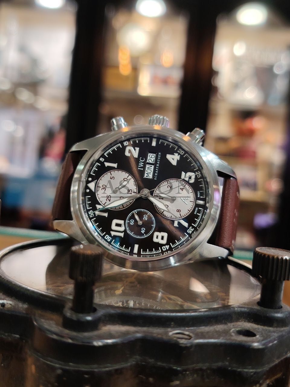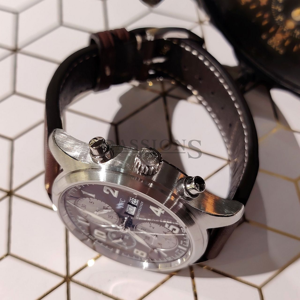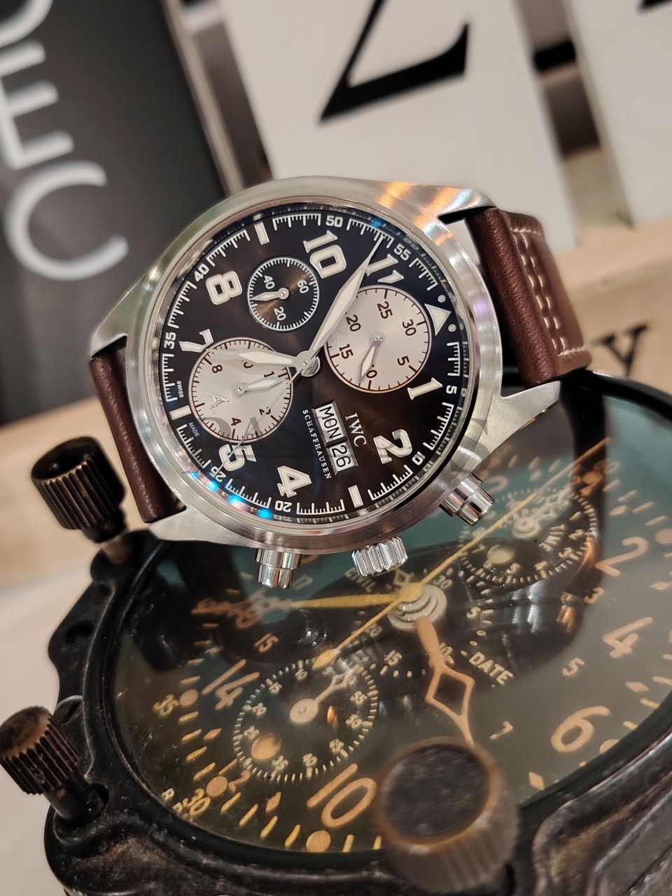 The pilot chronograph is best exemplified by IWC with their long history associated with military and aviation. This beautiful chronograph has a sunray brown dial with white registers and Arabic numerals. It is a discontinued limited edition model of the Antoine de Saint Exupéry series with a matching brown Italian Santoni leather strap. Only 1630 numbered pieces were produced and this watch was purchased for S$7220.00 with tax invoice. It is also a very wearable watch with a 42mm case instead of the latter series that went big and became regular production pieces; making this watch far more exclusive than the latter series.