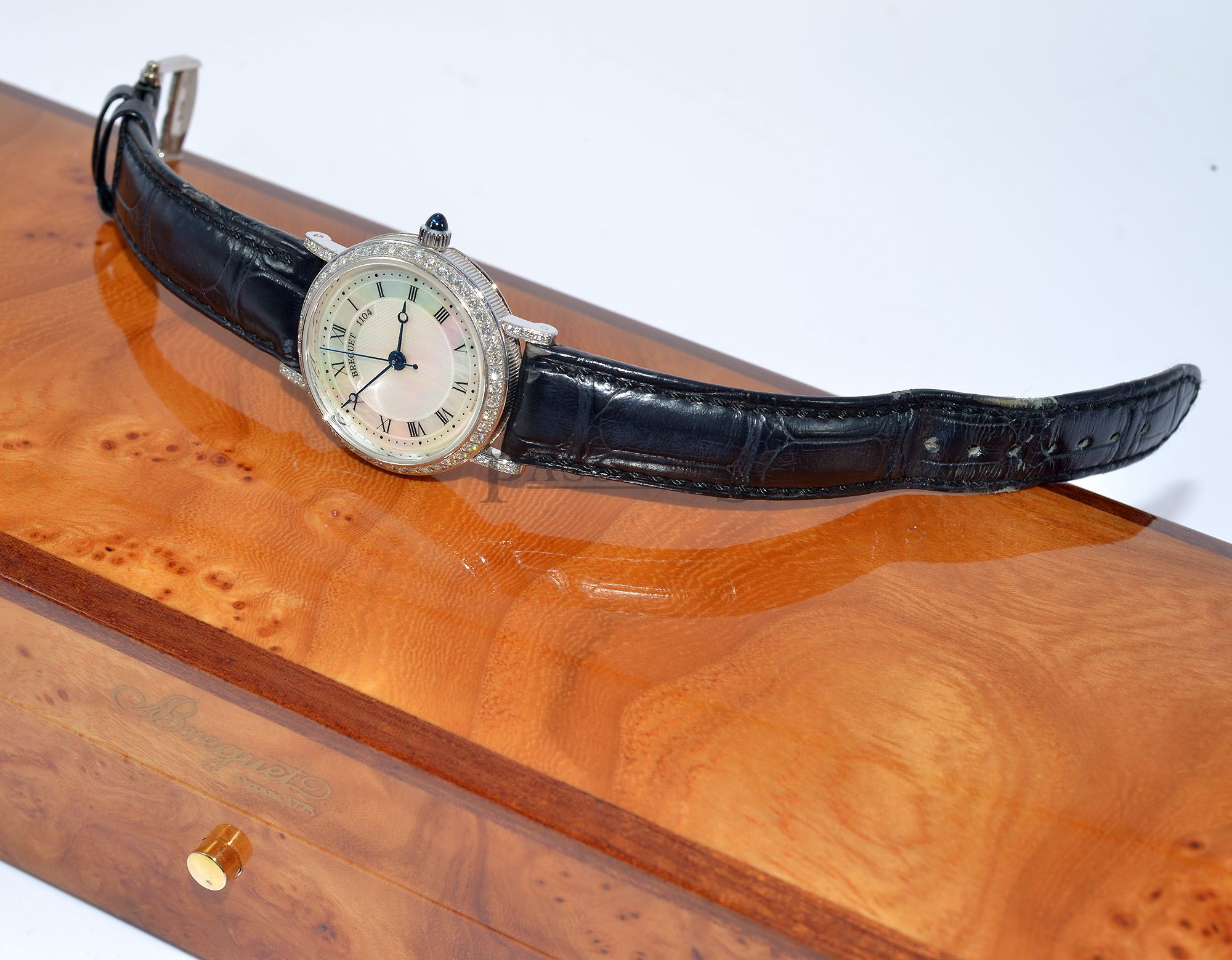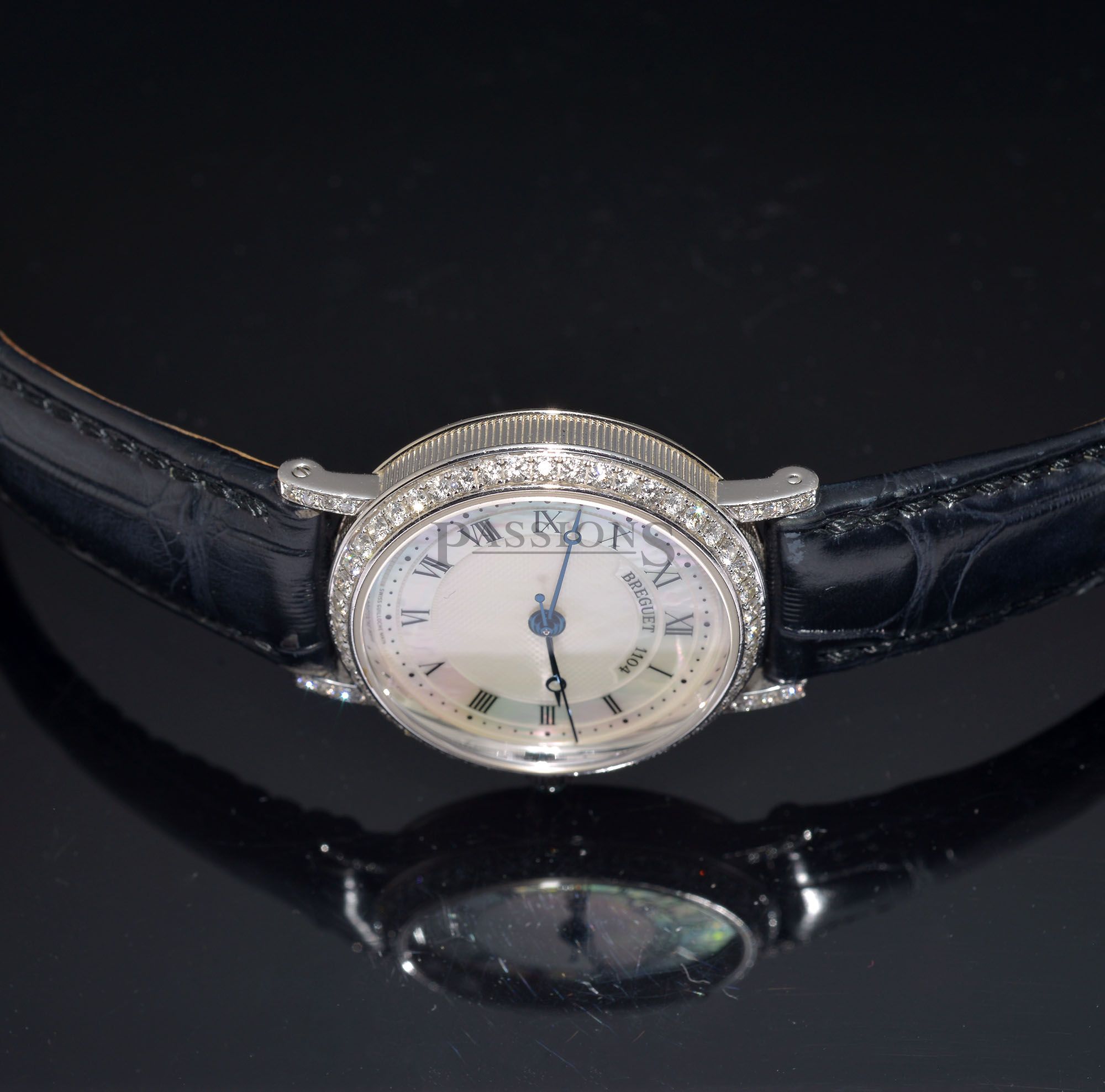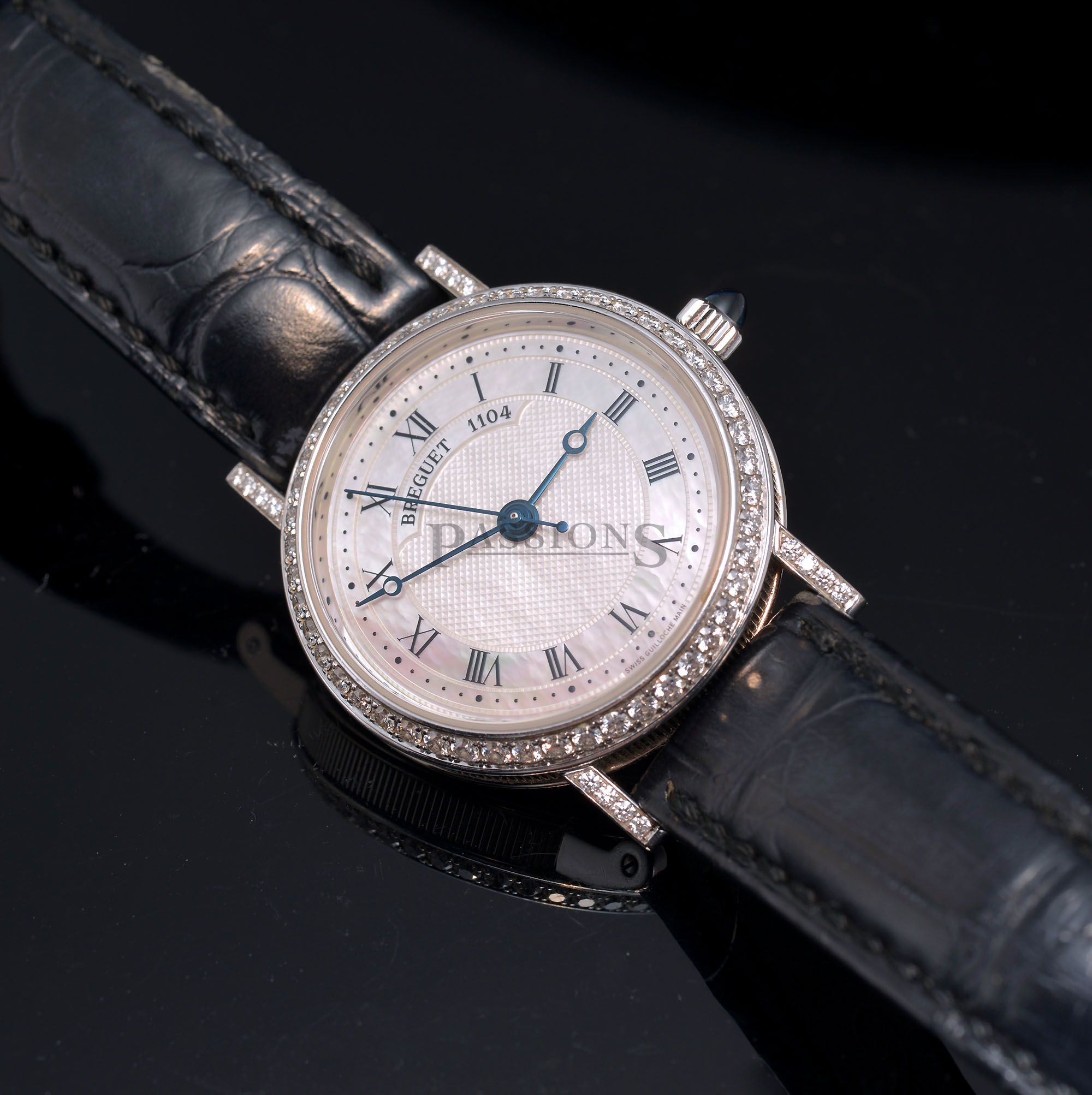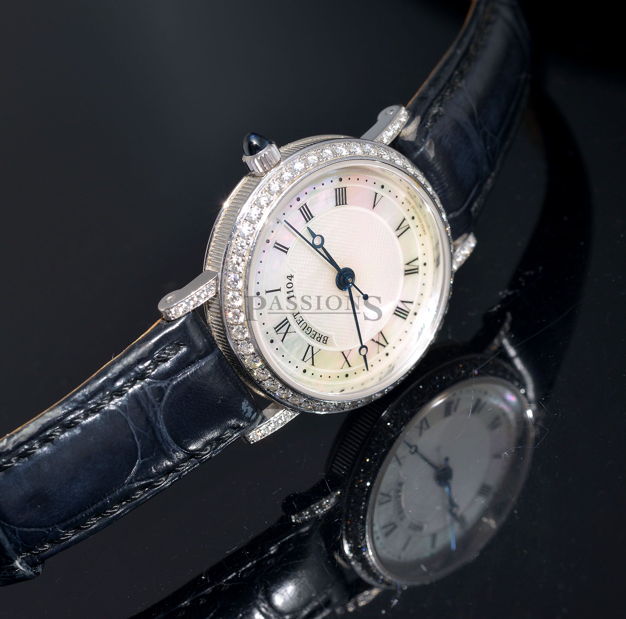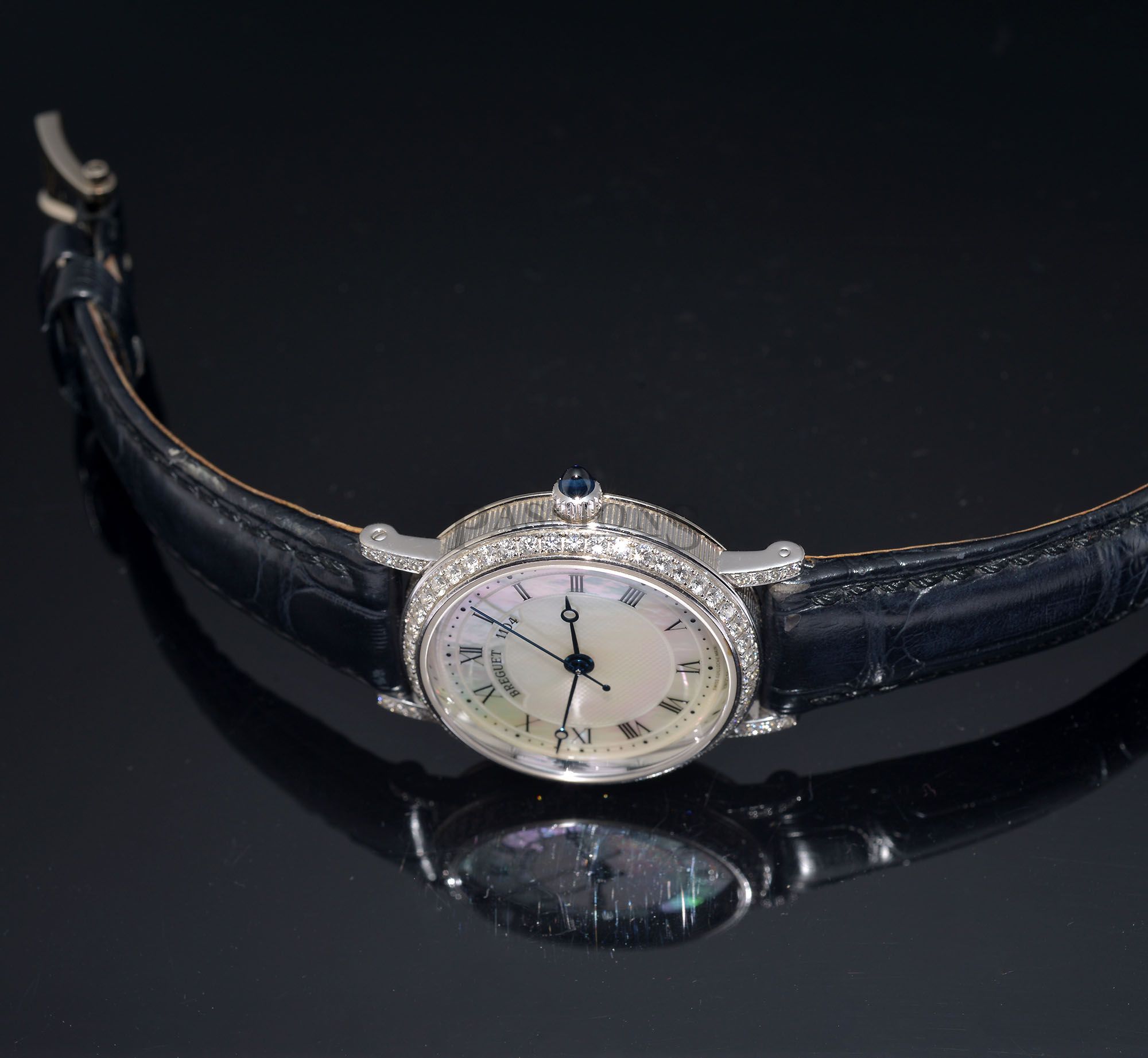 A captivating beauty from the house of Breguet. This lady’s classic in 18ct white gold is adorned with more than one carat of diamonds on the bezel and lugs. The watch is further fitted with a hand guilloché mother-of-pearl dial, blue sapphire cabochon crown and has a glass back that allows you to admire it’s beautiful automatic movement.