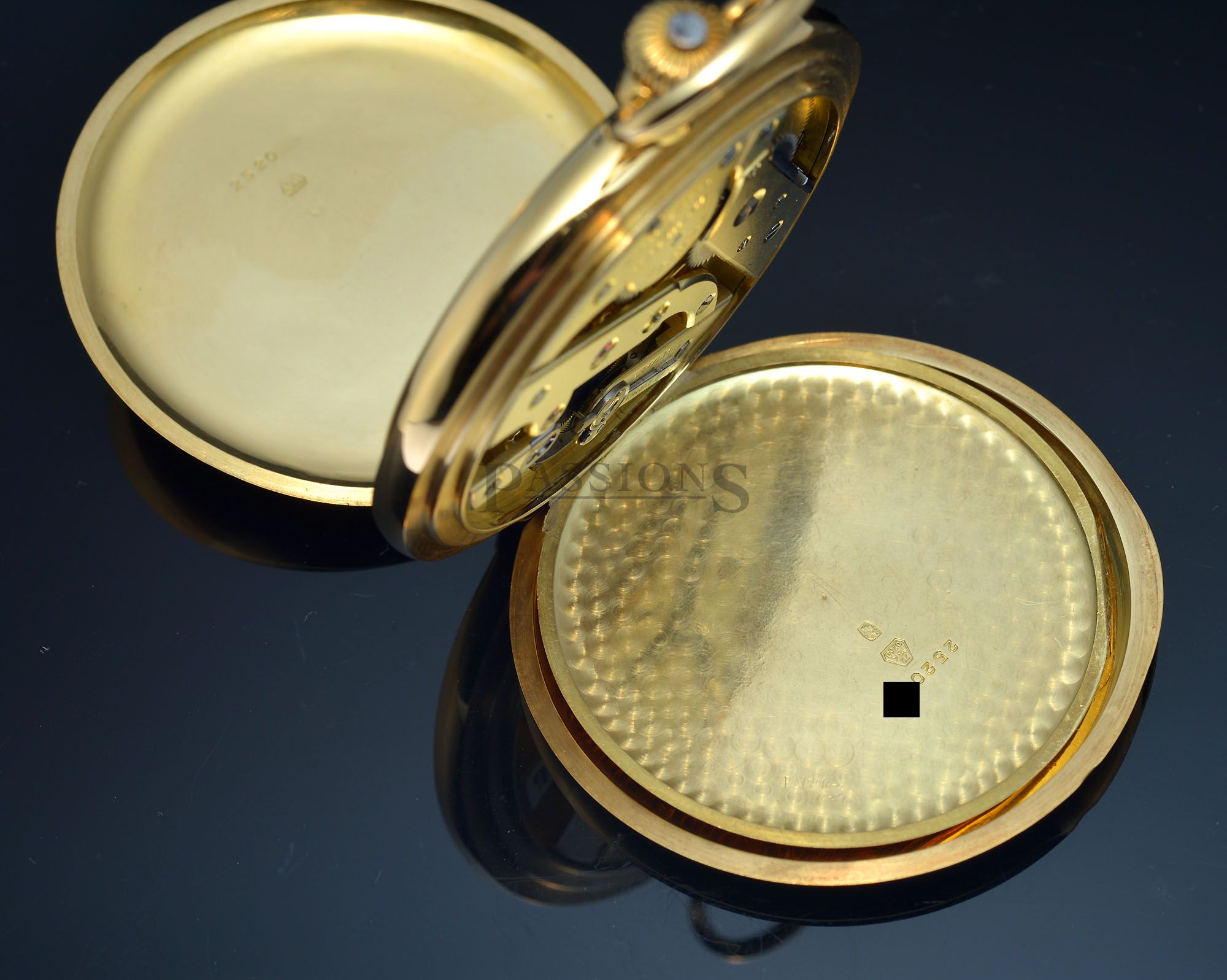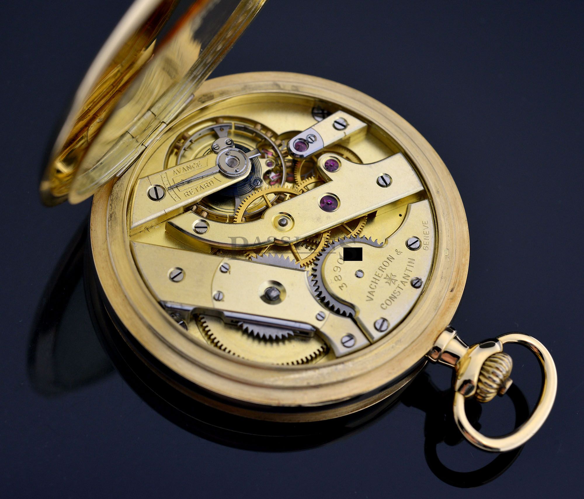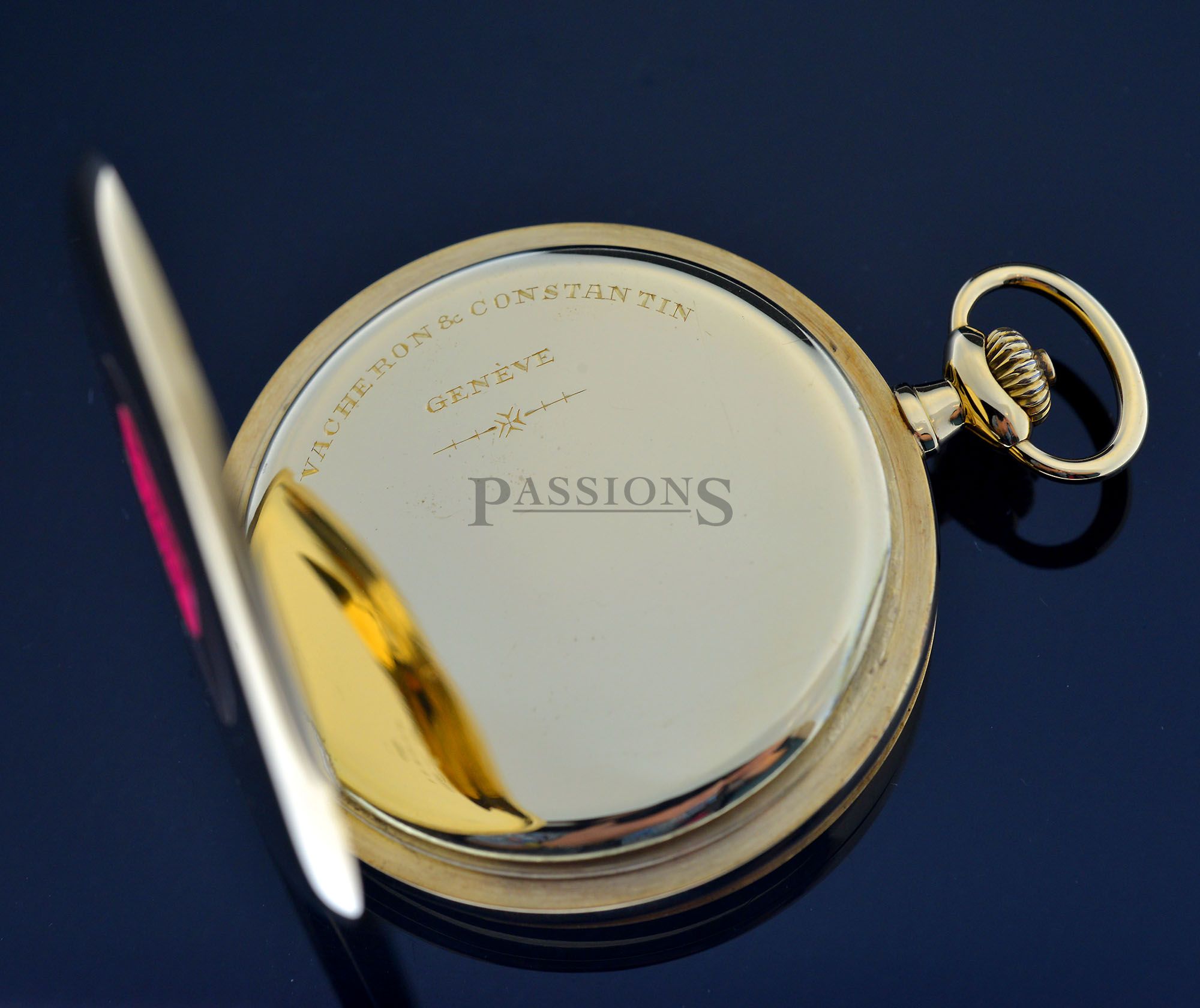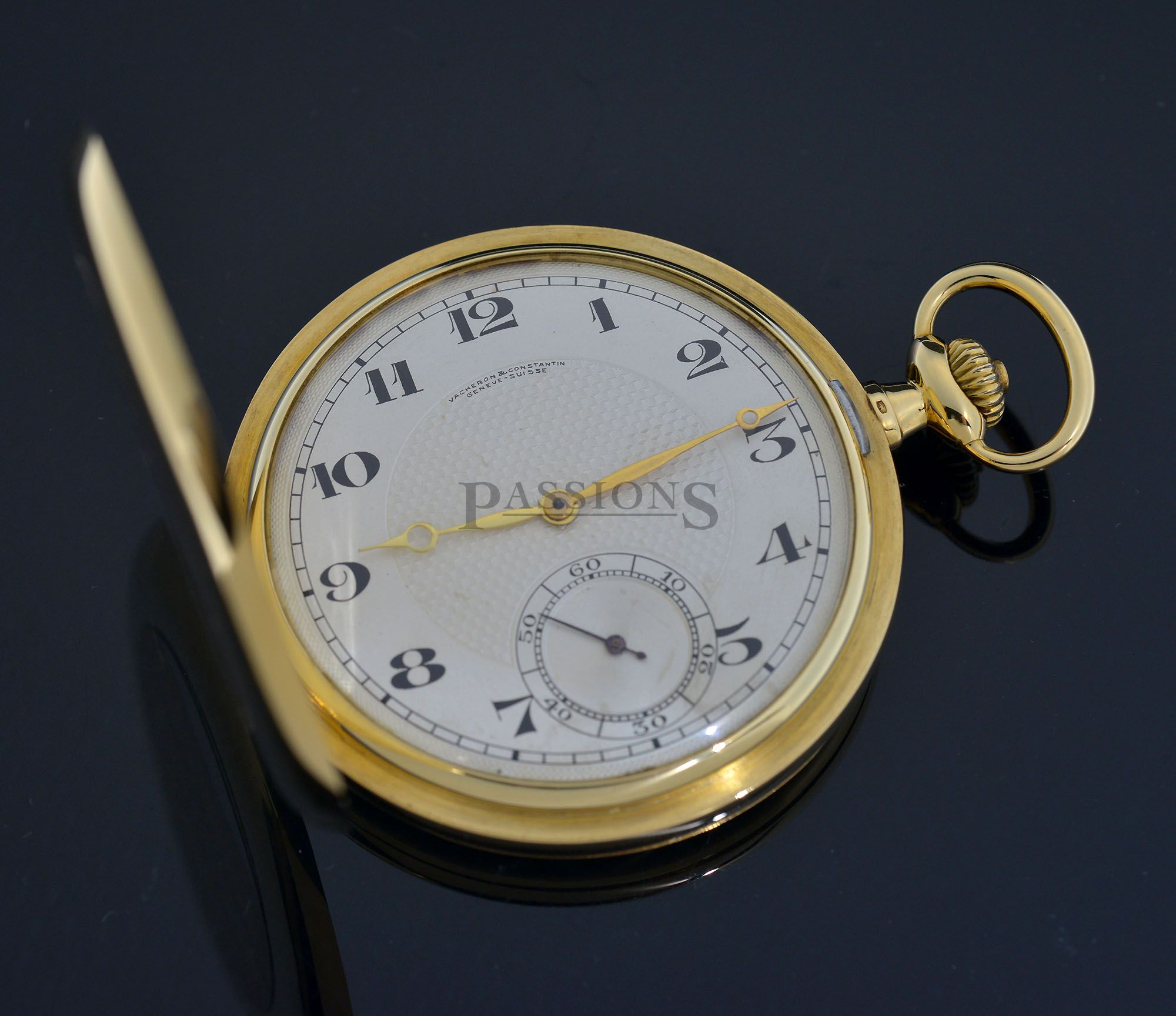 A handsome Vacheron & Constantin Geneve-Suisse Hunting cased pocket watch in heavy solid 18ct Yellow gold case. Fitted with a beautiful guilloche dial with hard enamelled markings. The markings on these dials were engraved plates with the black enamel paint filled in, fired, brushed & polished before being painted so they last almost an eternity except the silvered surface that ages over passing of time.