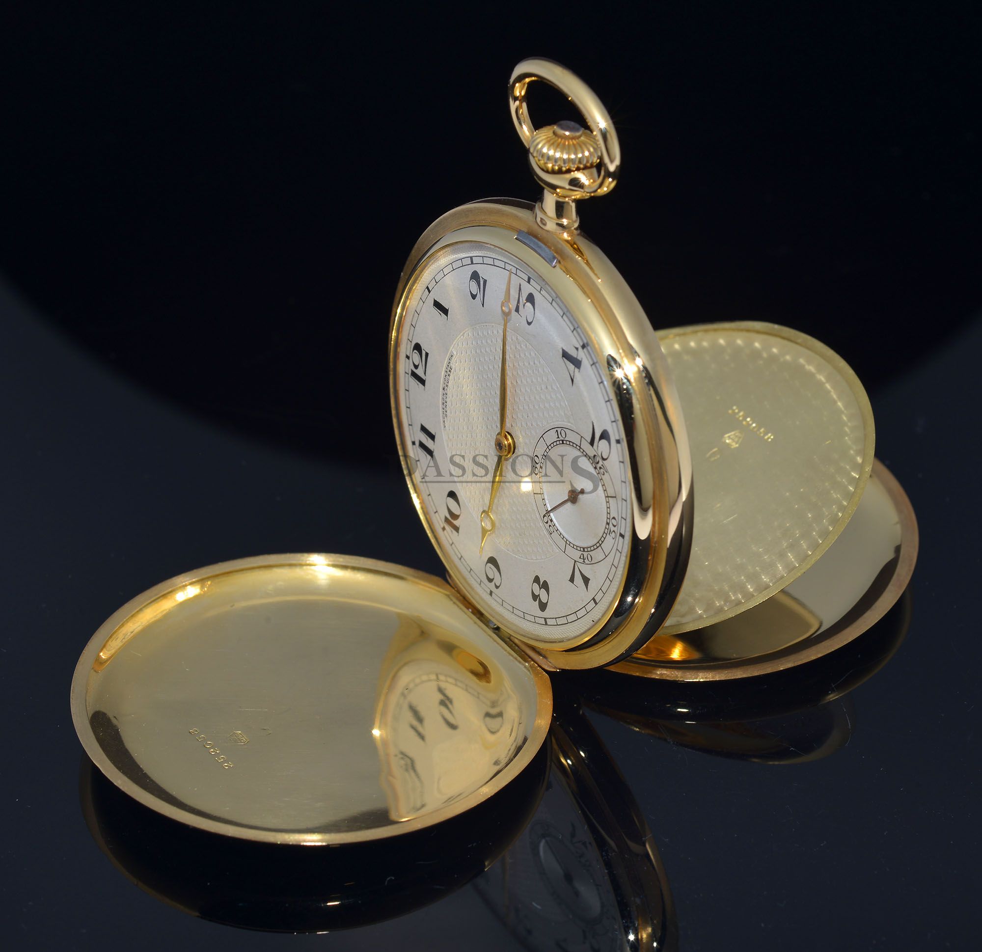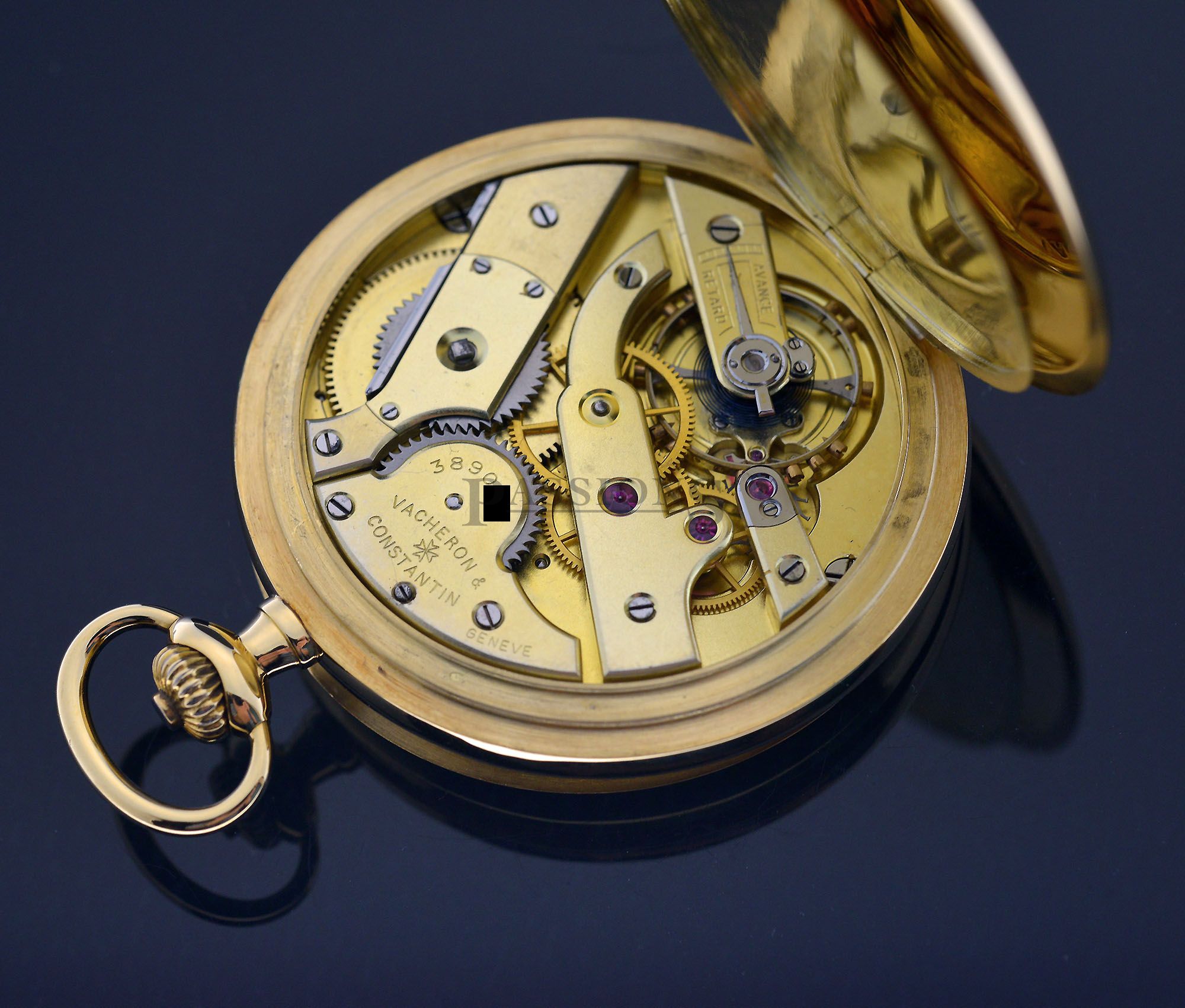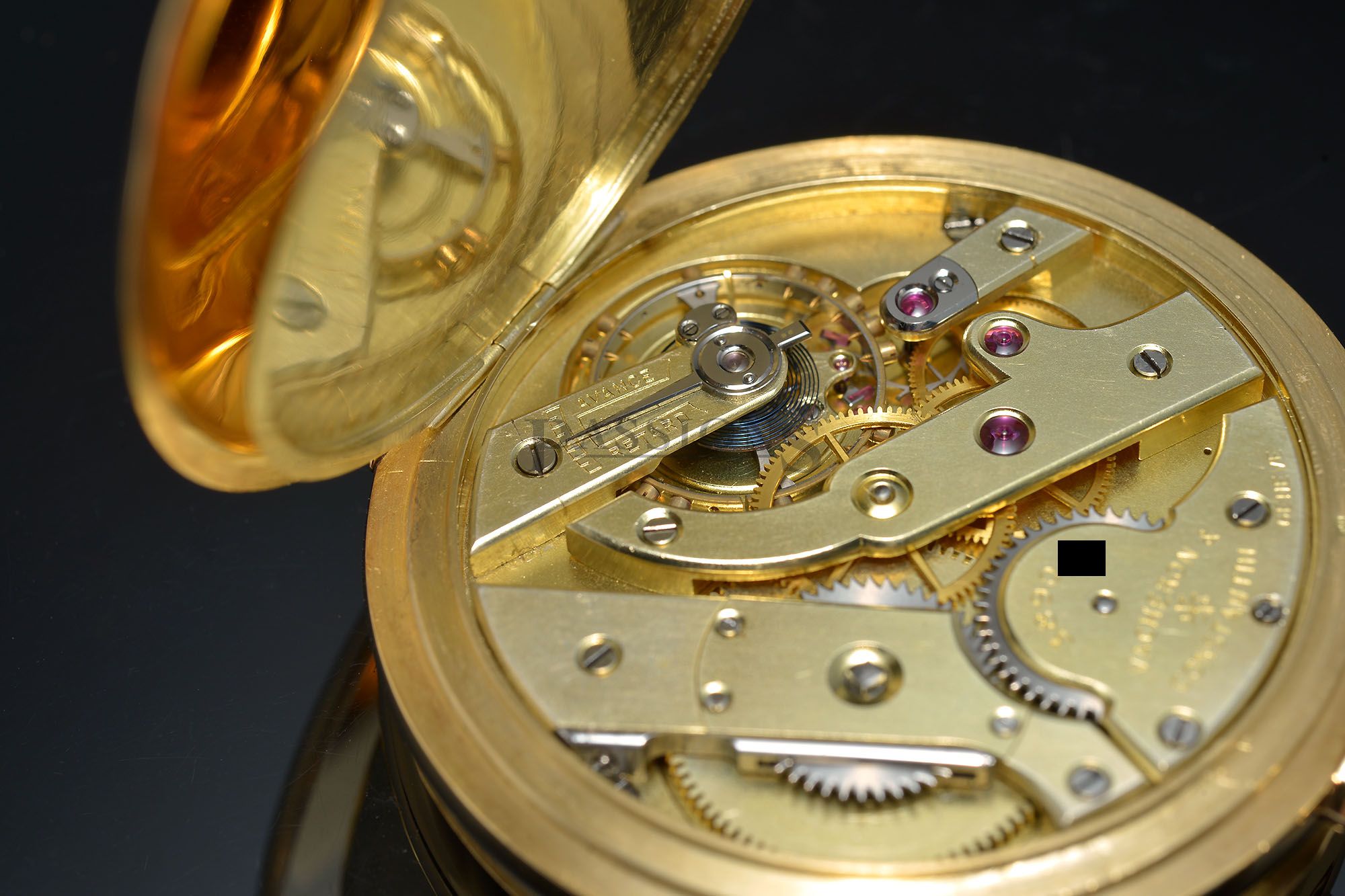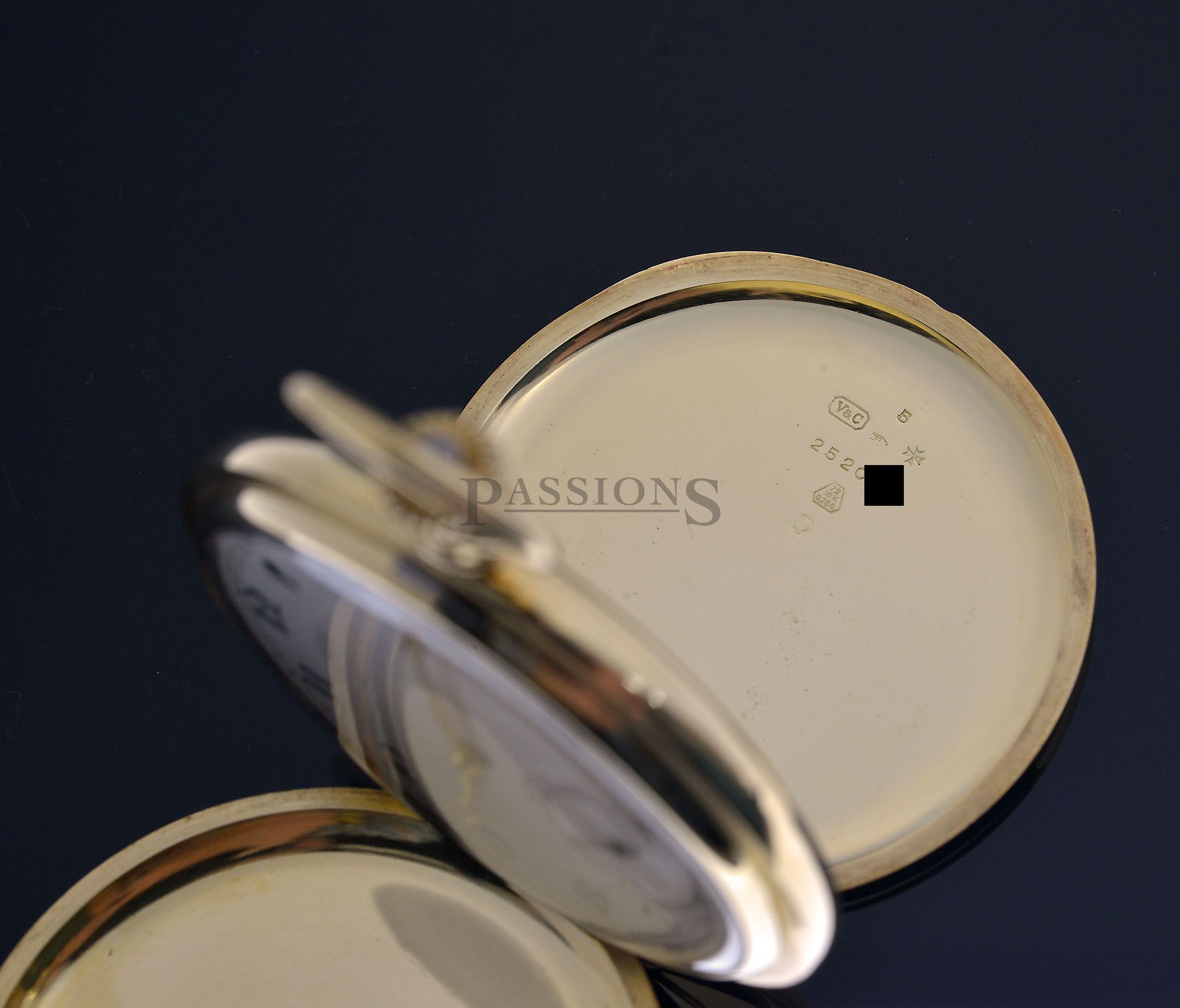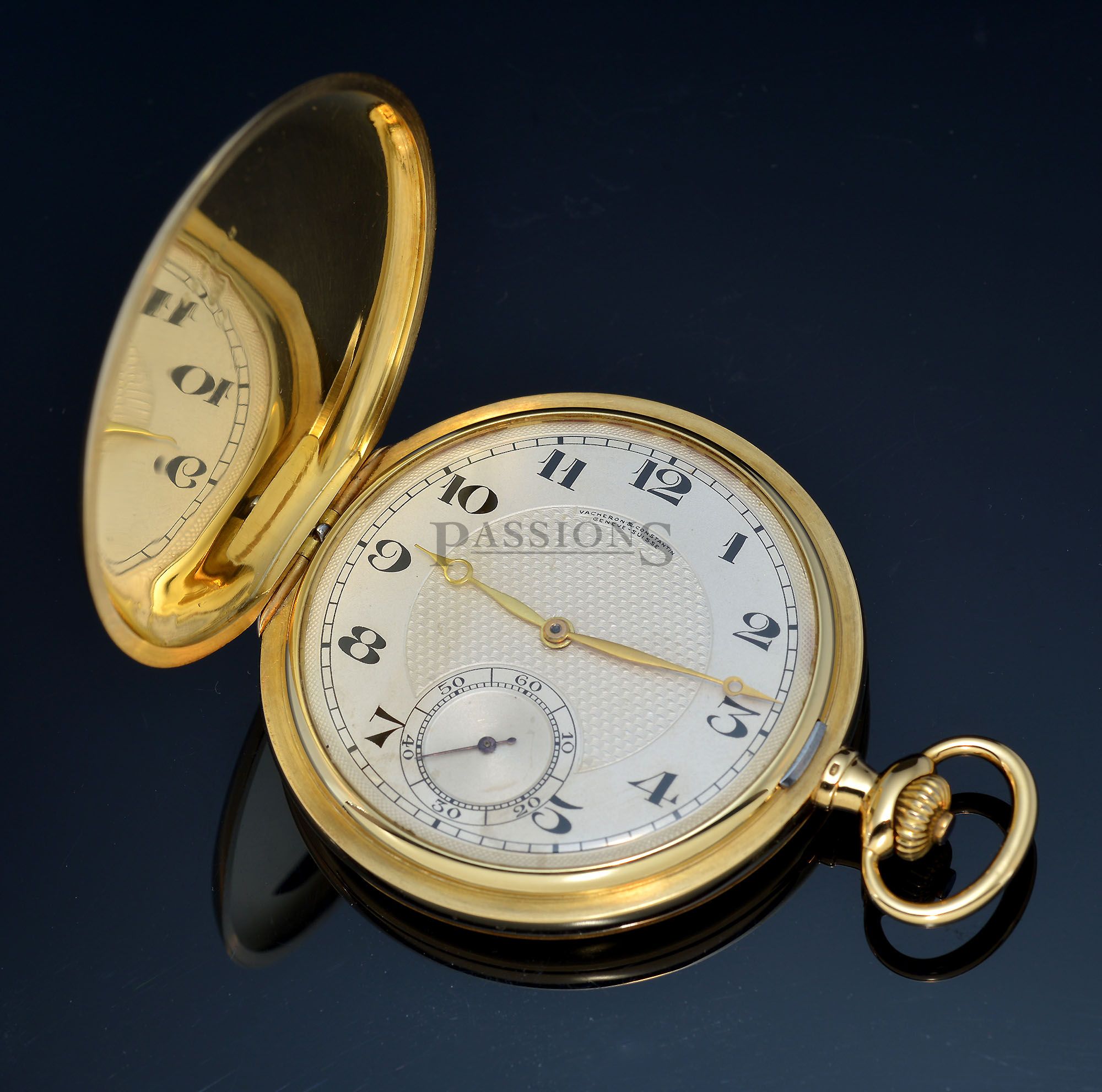 A handsome Vacheron & Constantin Geneve-Suisse Hunting cased pocket watch in heavy solid 18ct Yellow gold case. Fitted with a beautiful guilloche dial with hard enamelled markings. The markings on these dials were engraved plates with the black enamel paint filled in, fired, brushed & polished before being painted so they last almost an eternity except the silvered surface that ages over passing of time.