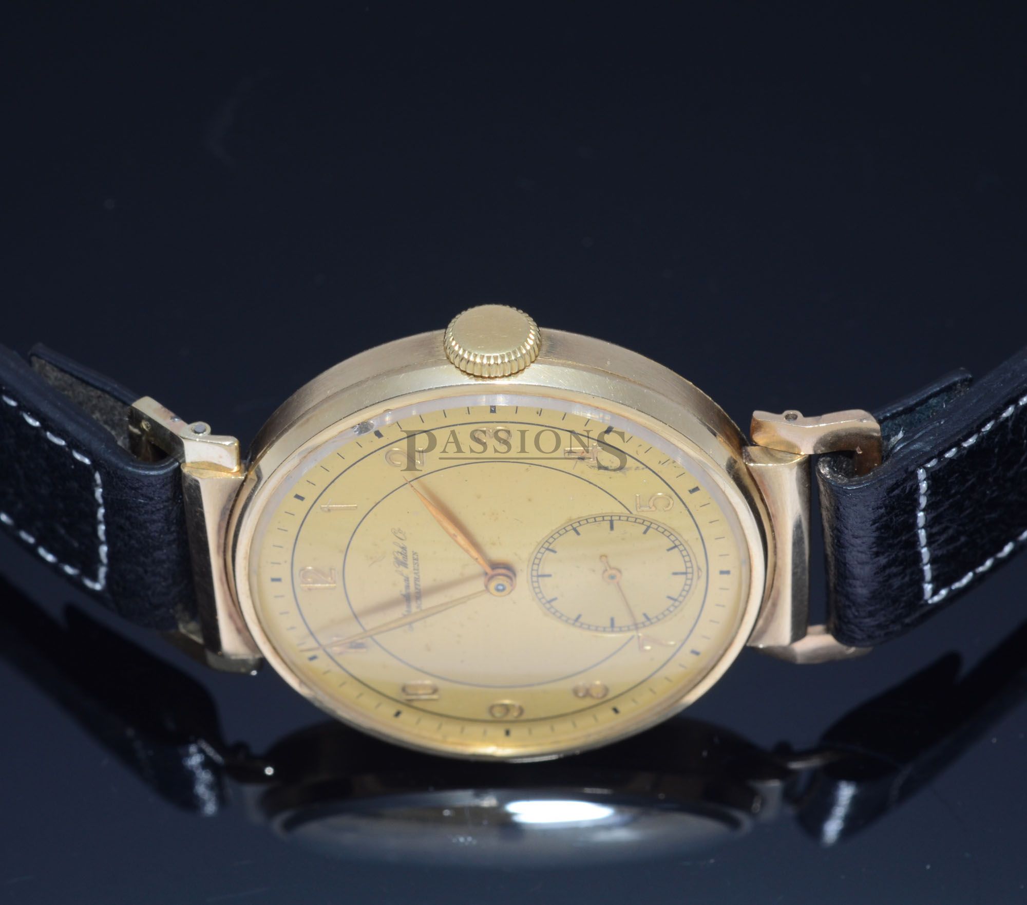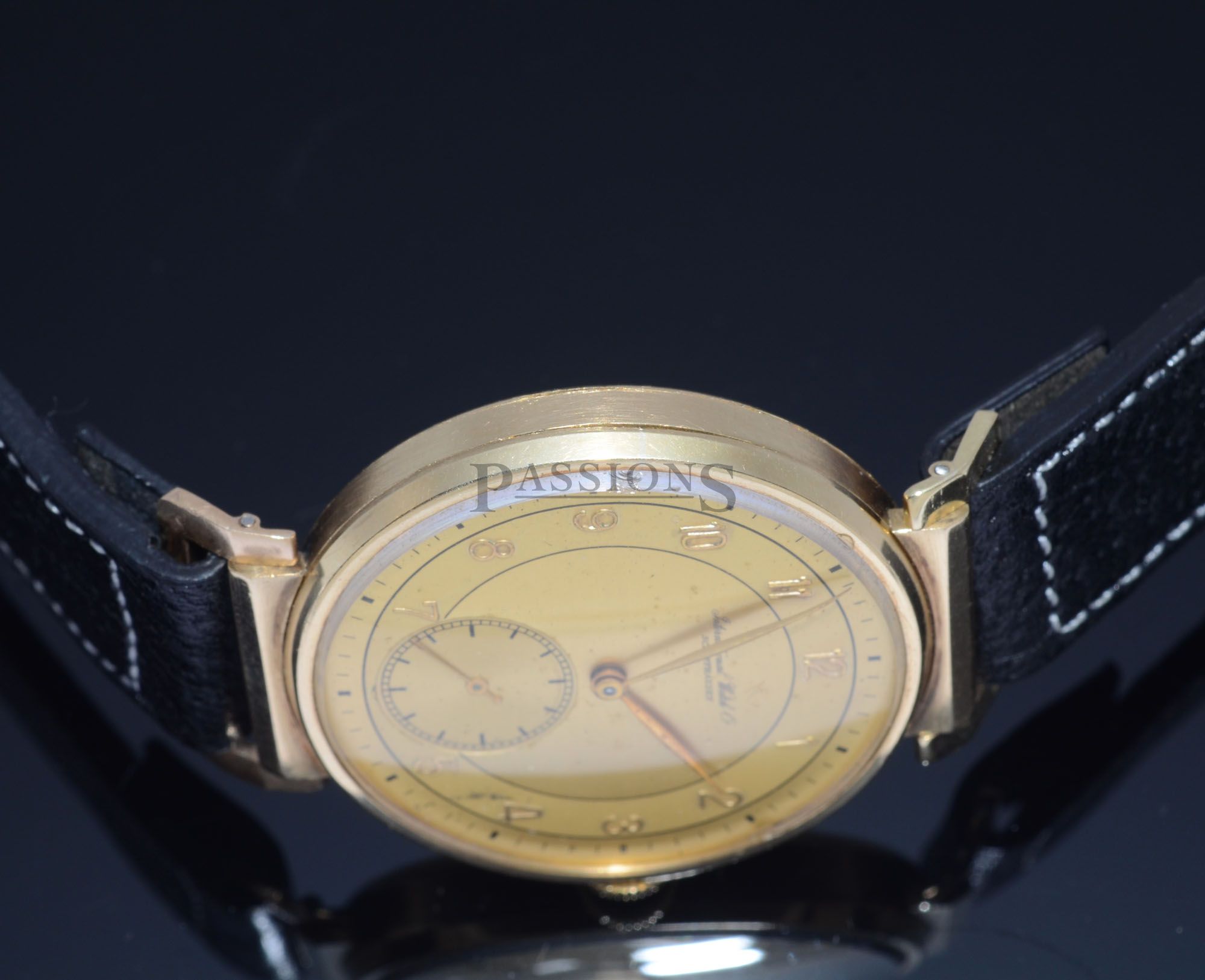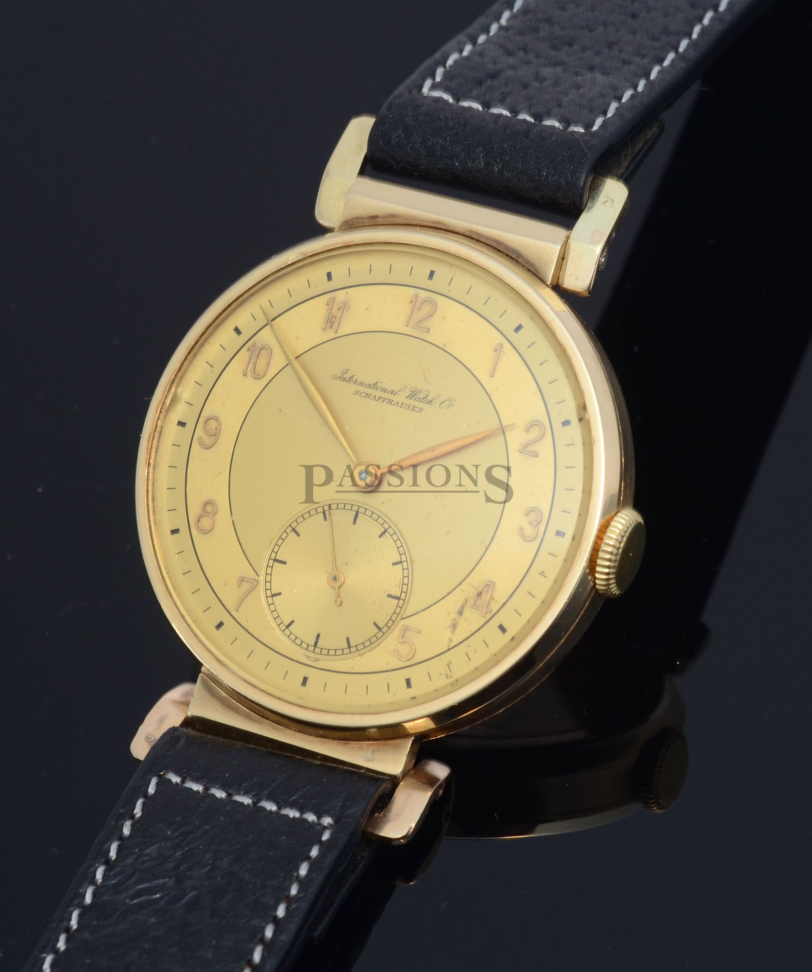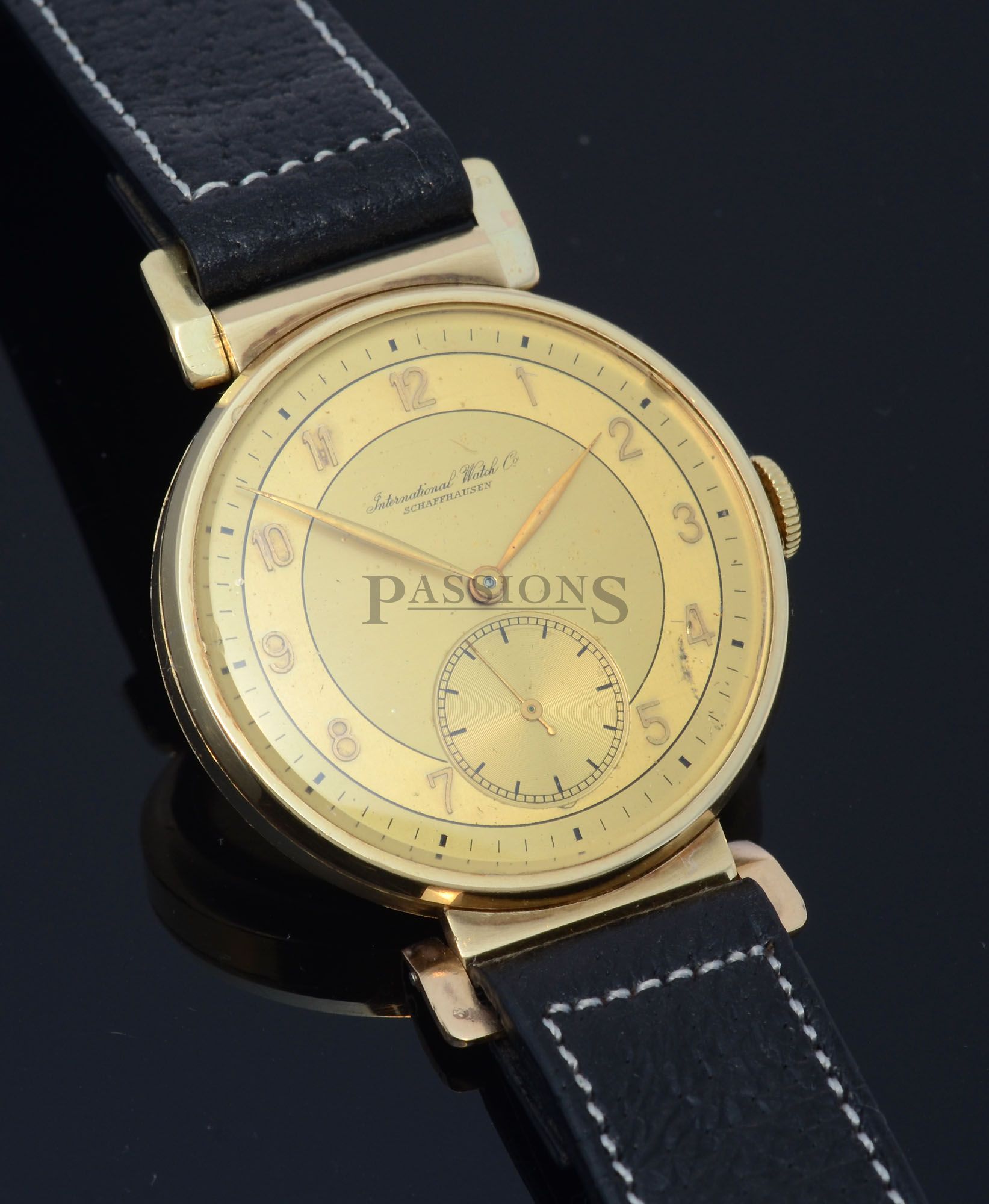 Rare is an often used word and this particular IWC dating back to 1941 from the early part of WW2 certainly deserves it. The large 35mm solid gold case (lug to lug is a 48mm) was huge for it’s time as most watches were 30mm and it has a pair of unique flexible lugs that further extends it’s size to wrap around your wrist. This attractive design was very popular in the late 1930s to early 40s but few survived the war and today, vintage watches with such case design are sought after collector’s items.