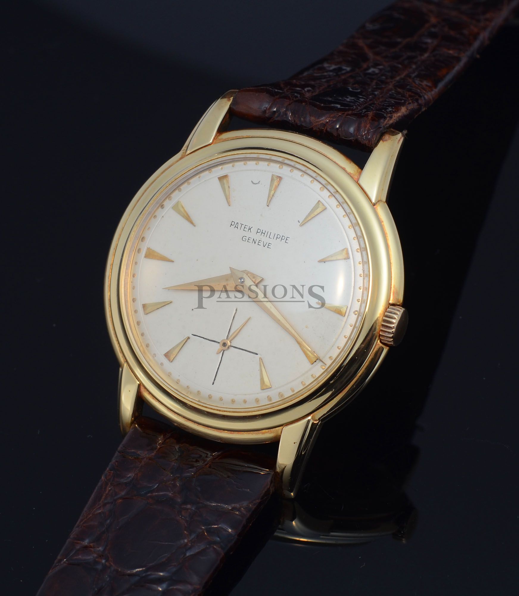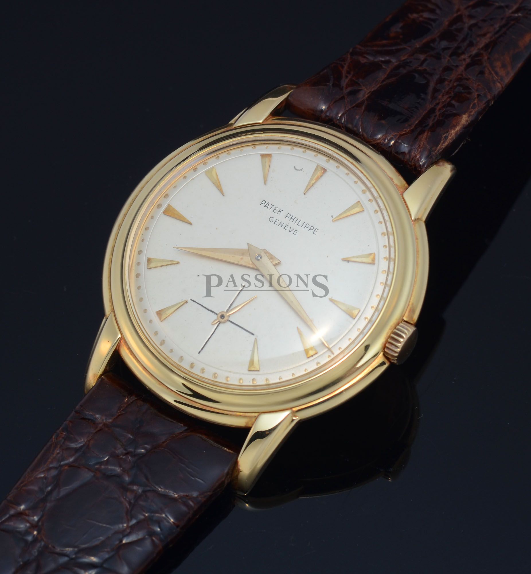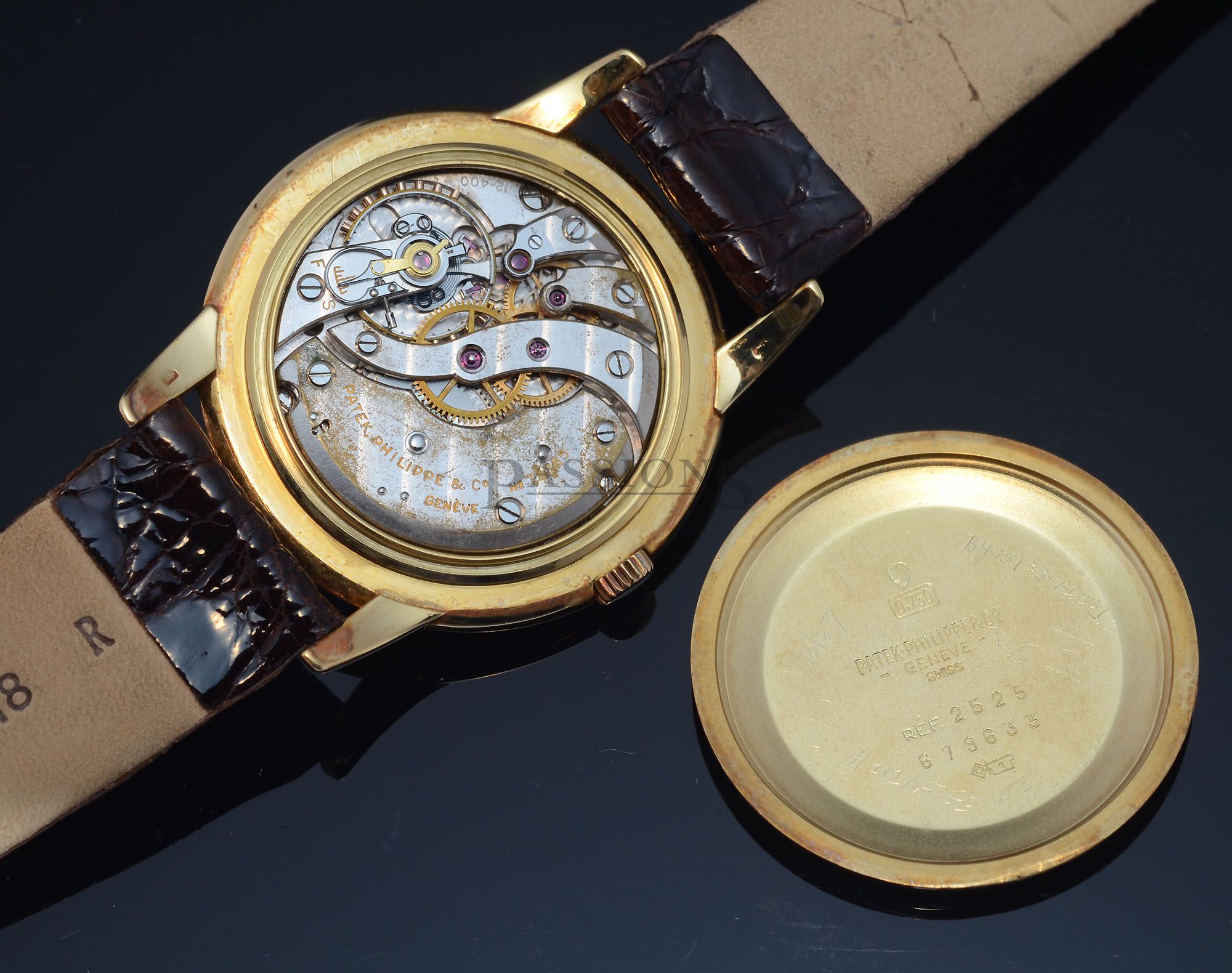 The 18KYG case features a stepped bezel and down-turned stepped lugs that makes the watch really attractive. It has a snap-on back and crown is unsigned. The dial shows some patina and spotting but nothing too serious as can be seen. The movement shows some brassing on the bridges but the Geneva stripes are clearly visible. The Calibre 12-400 was introduced in 1949 and features a new regulator and shock-resisting absorber over the 12-120 that was introduced in 1934 and based on a 12 ligne LeCoultre calibre. This was the movement for all Calatravas and some important models of that era such as the Ref.2523 Worldtime cloisonné dial that sold for US$7.8million in 2021.