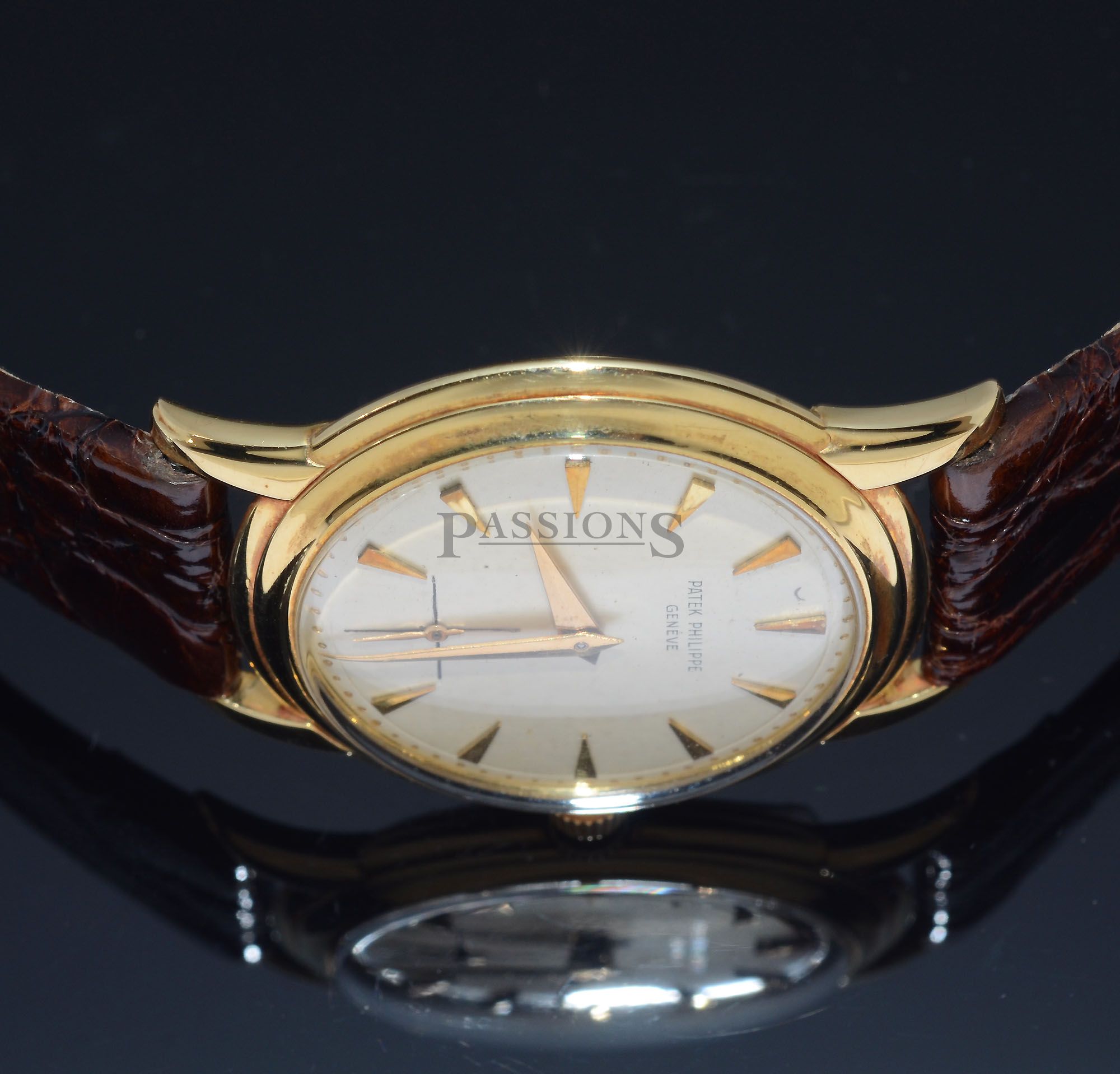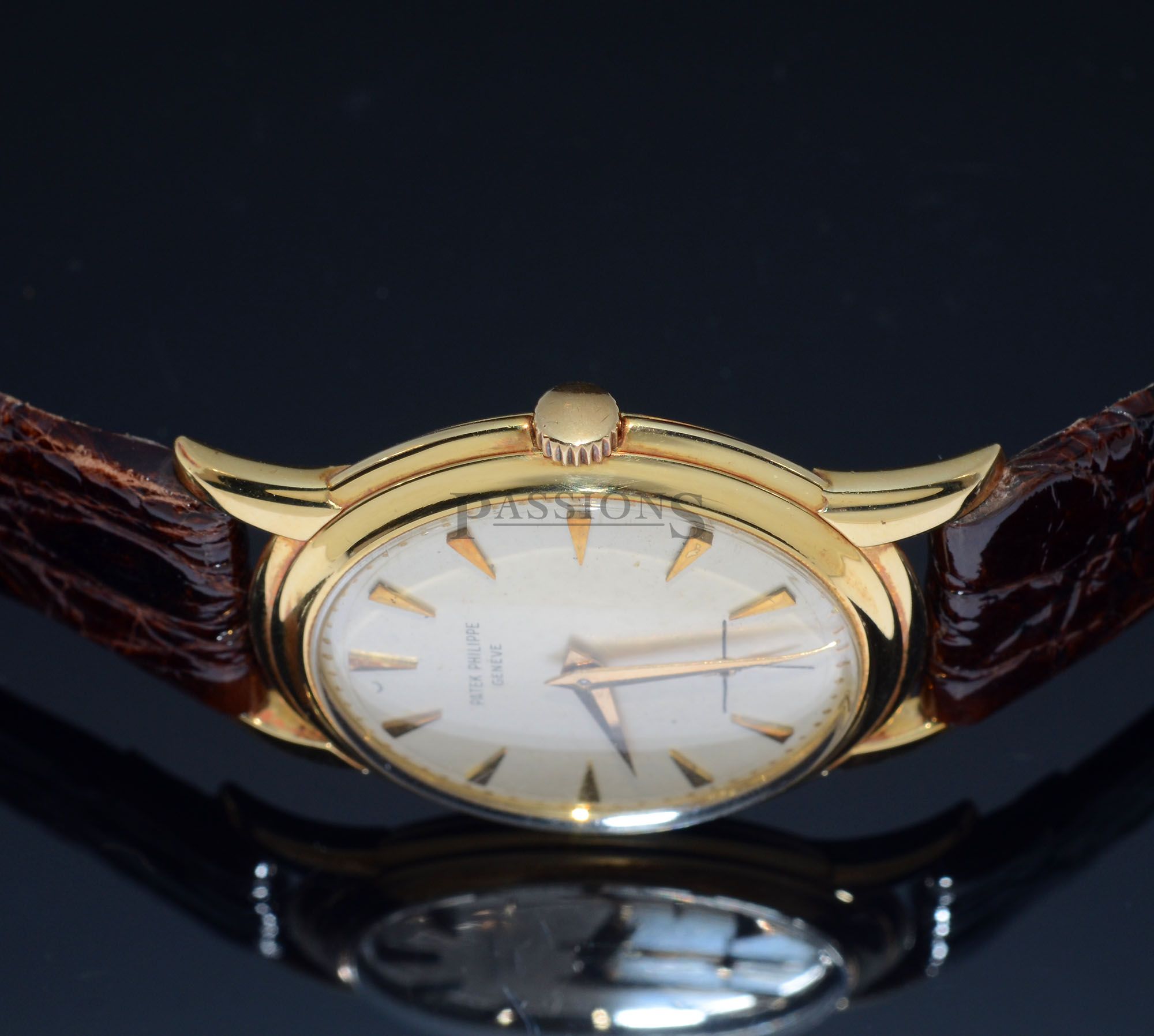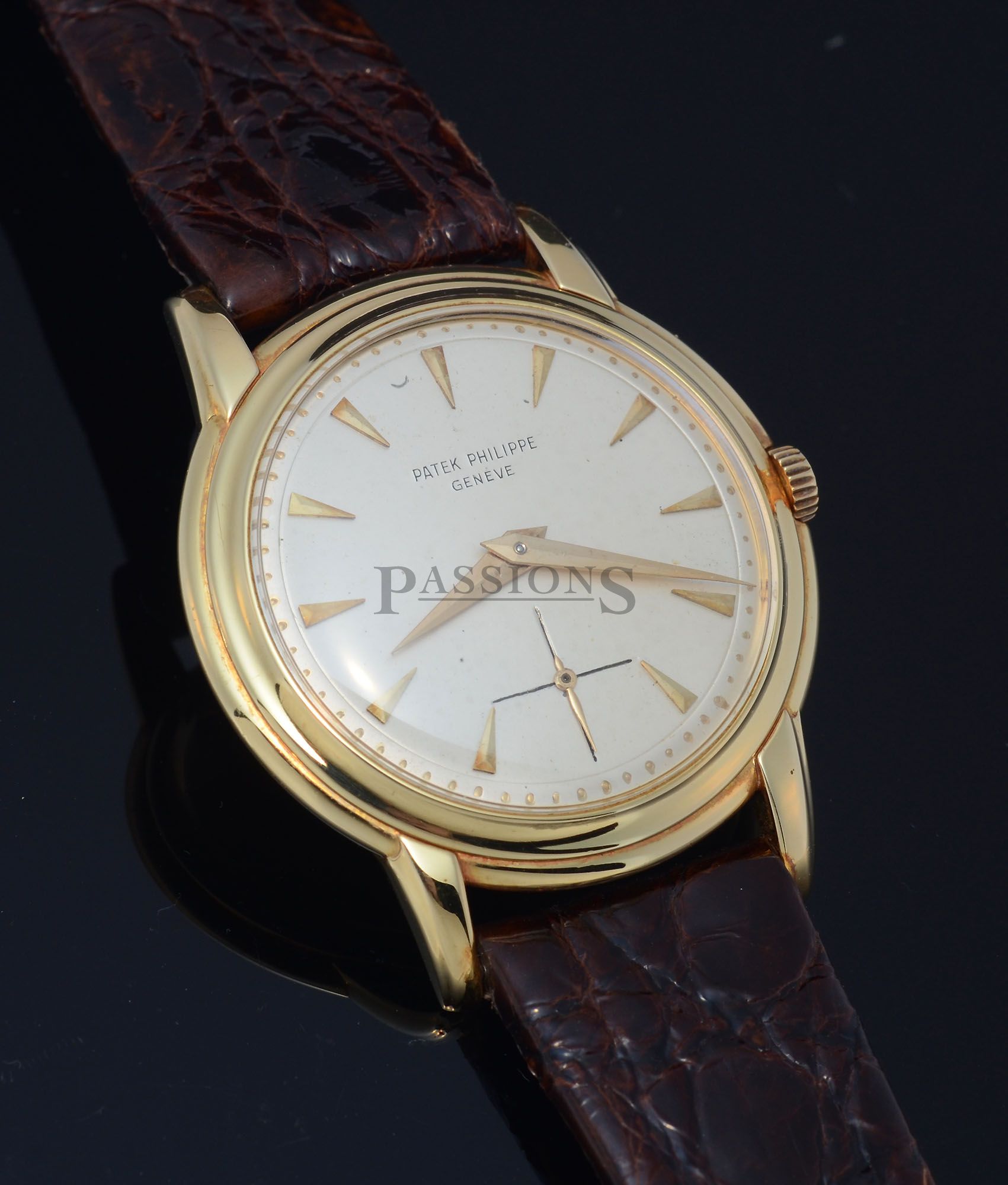 The 18KYG case features a stepped bezel and down-turned stepped lugs that makes the watch really attractive. It has a snap-on back and crown is unsigned. The dial shows some patina and spotting but nothing too serious as can be seen. The movement shows some brassing on the bridges but the Geneva stripes are clearly visible. The Calibre 12-400 was introduced in 1949 and features a new regulator and shock-resisting absorber over the 12-120 that was introduced in 1934 and based on a 12 ligne LeCoultre calibre. This was the movement for all Calatravas and some important models of that era such as the Ref.2523 Worldtime cloisonné dial that sold for US$7.8million in 2021.