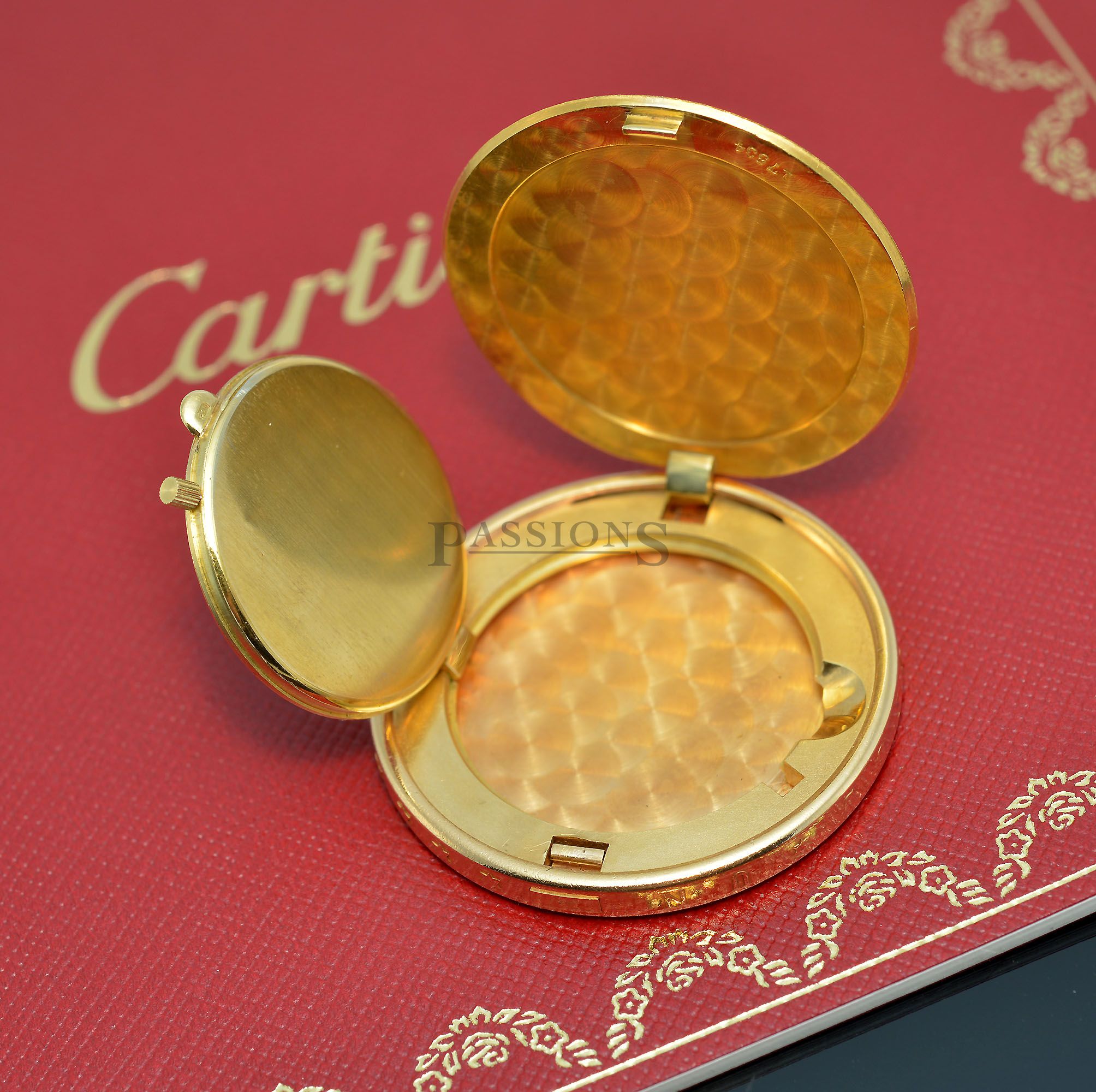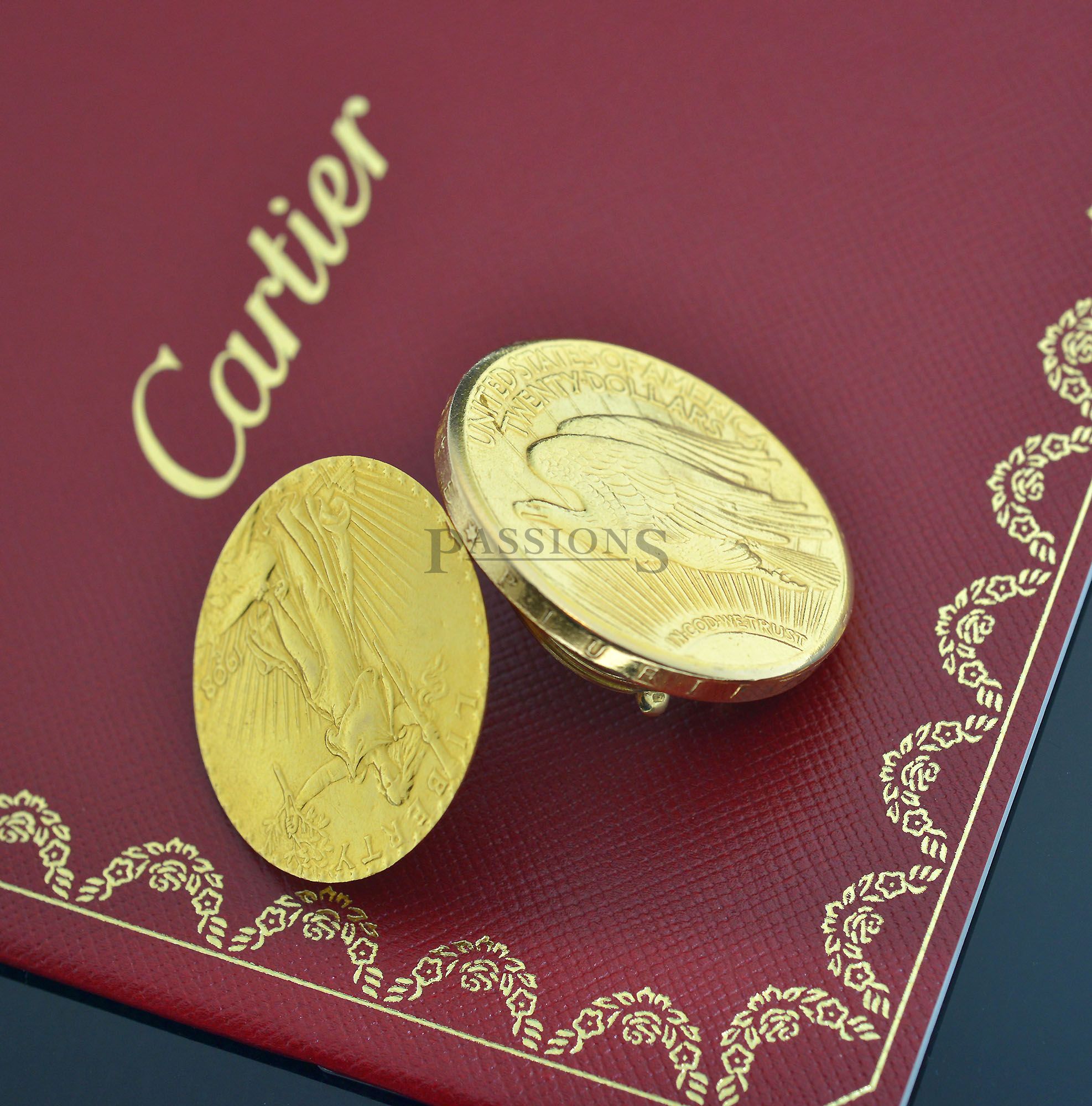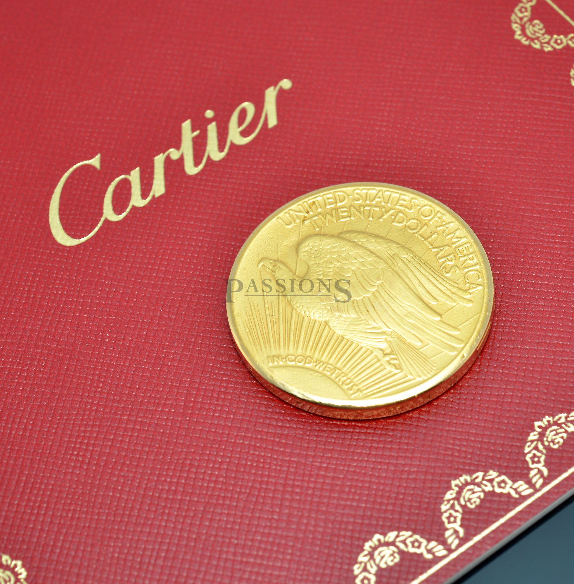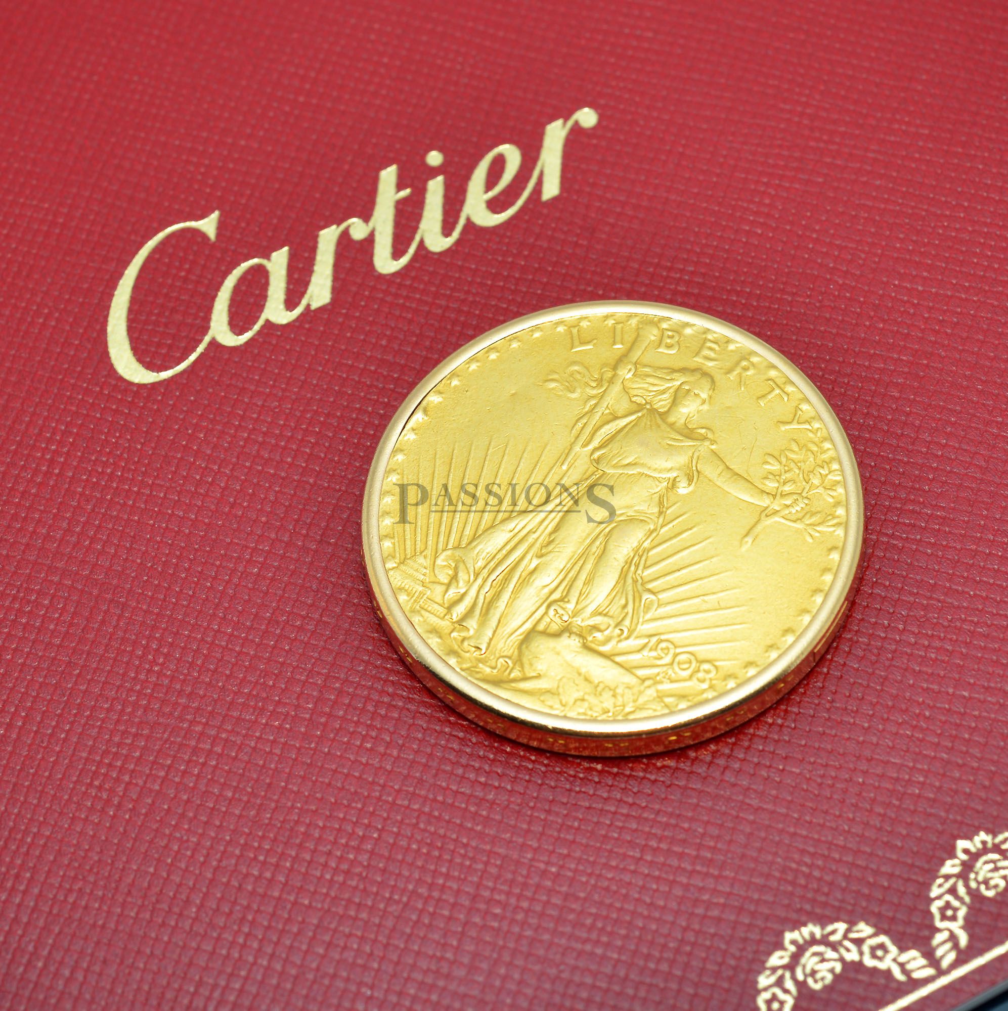 Passions is pleased to offer another rare and whimsical novelty by Cartier, created by the house of Piaget some six decades ago with a watch hidden in a US twenty dollar solid gold coin. Upon depressing a concealed rectangular button on the rim of the coin, the cover pops open to reveal a watch that you can lift up to wind and set time as seen from our images here.