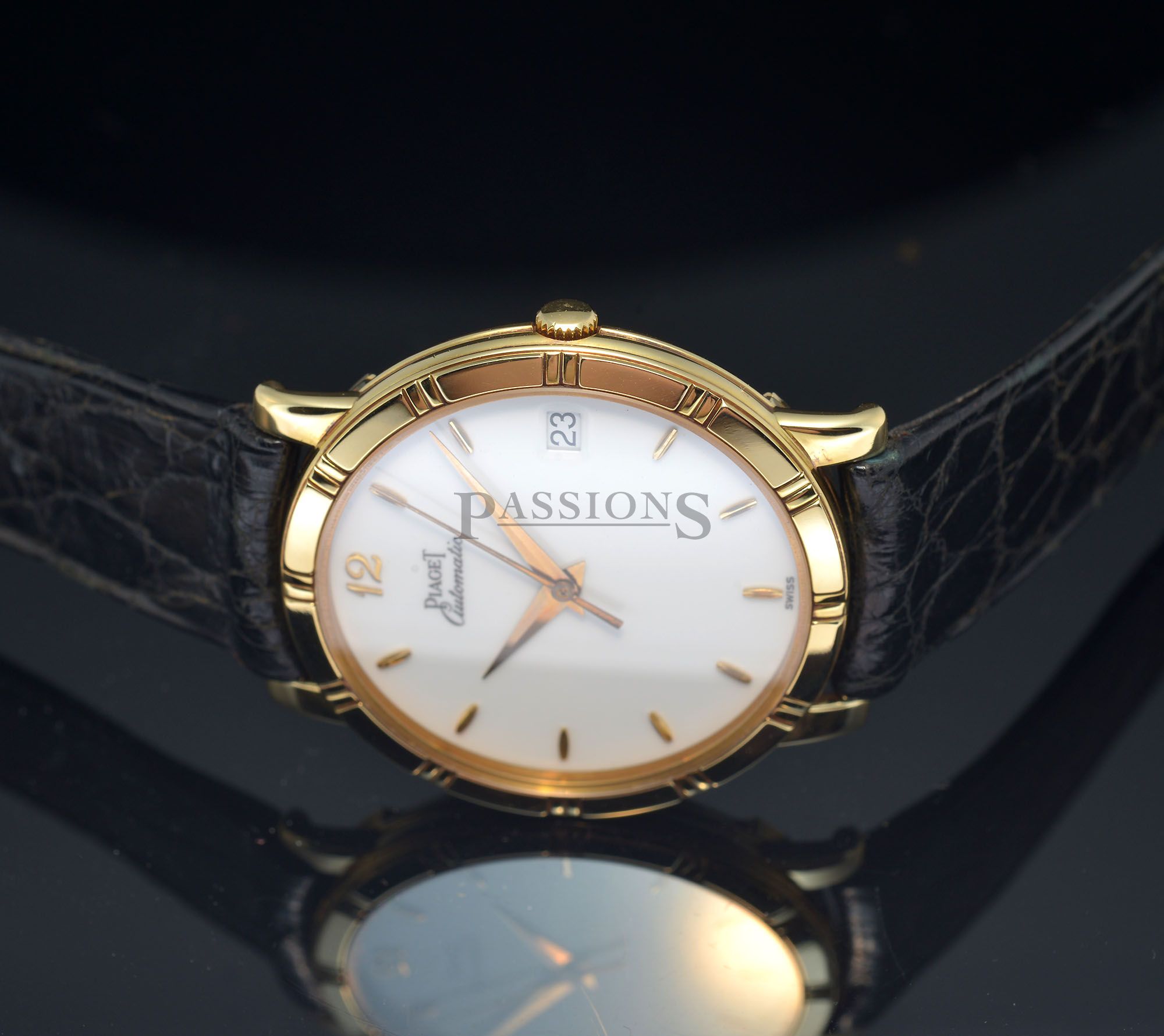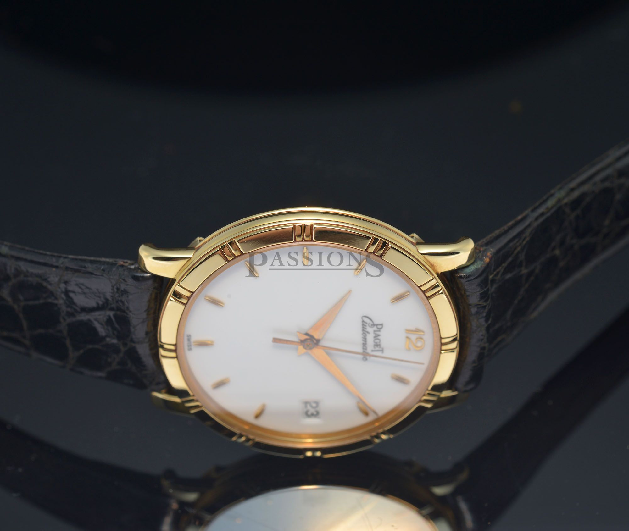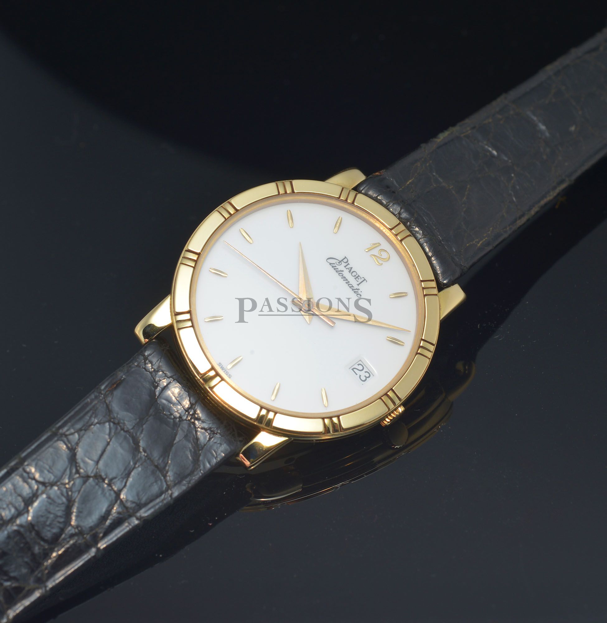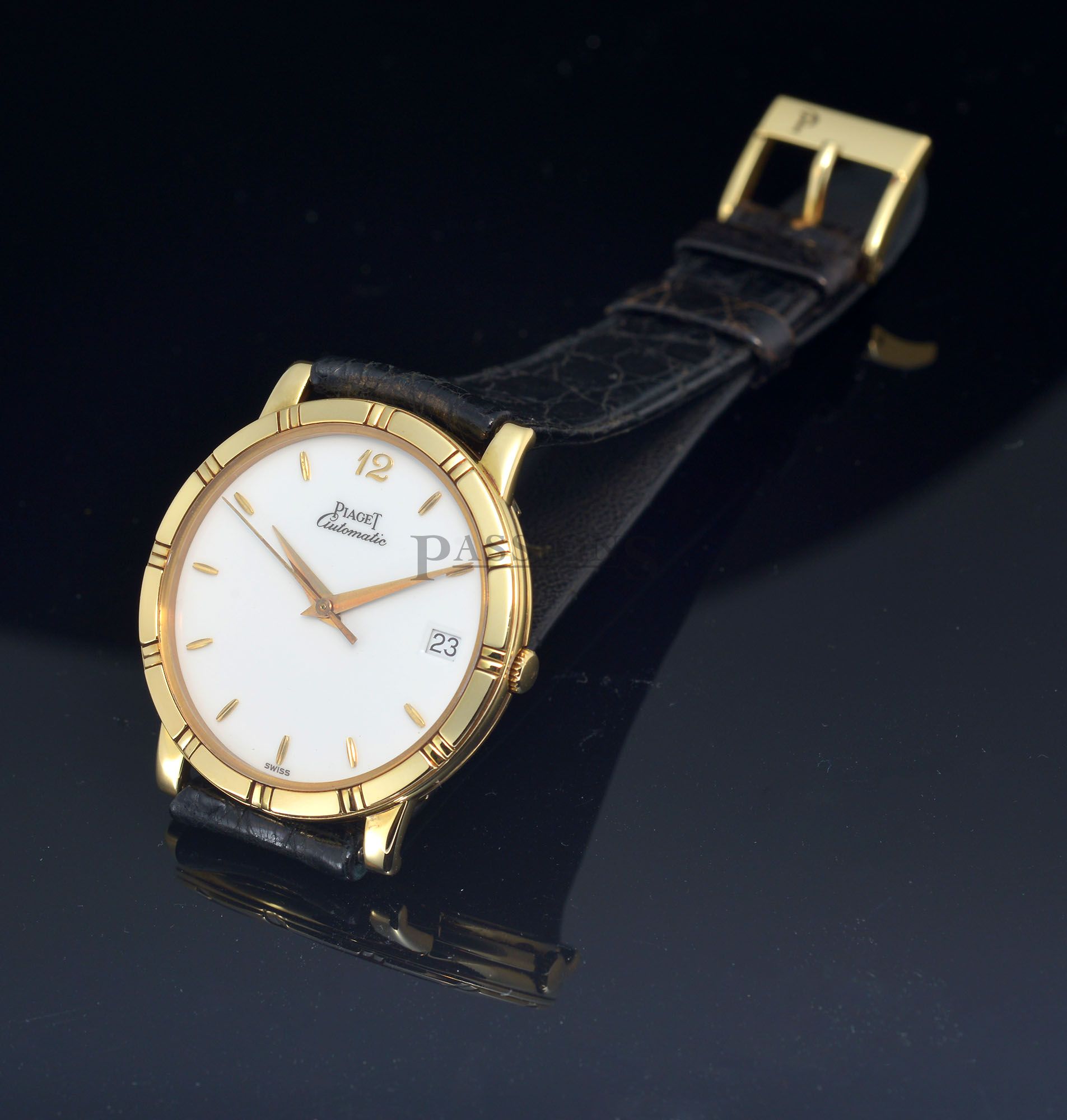 Here’s a beautiful solid 18ct gold automatic watch with a date. Made by Piaget in the late 1990s under Ref.GOA 15923 & named Dancer. It has a white enamel painted dial and gold appliqué batons & an Arabic 12.