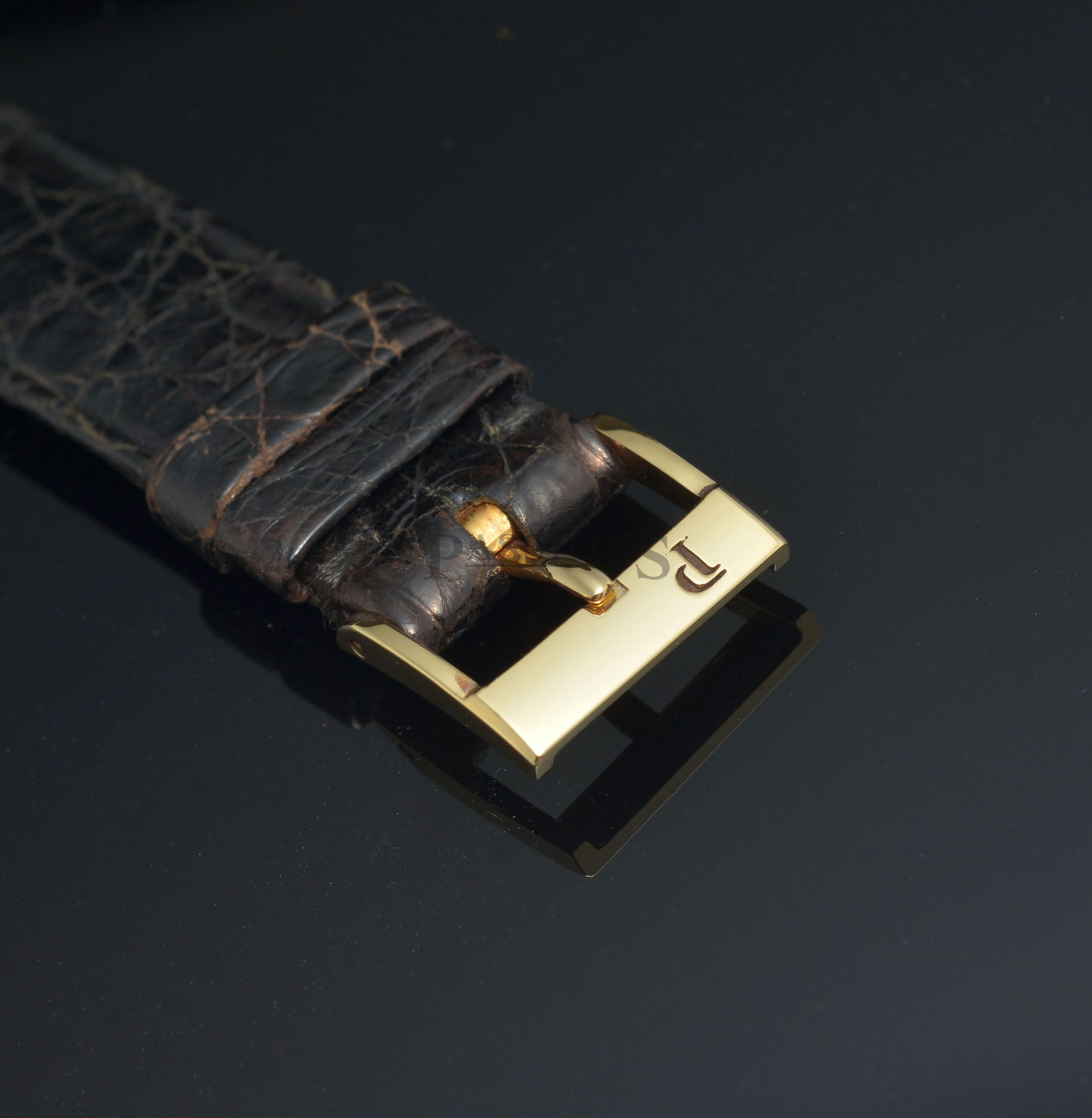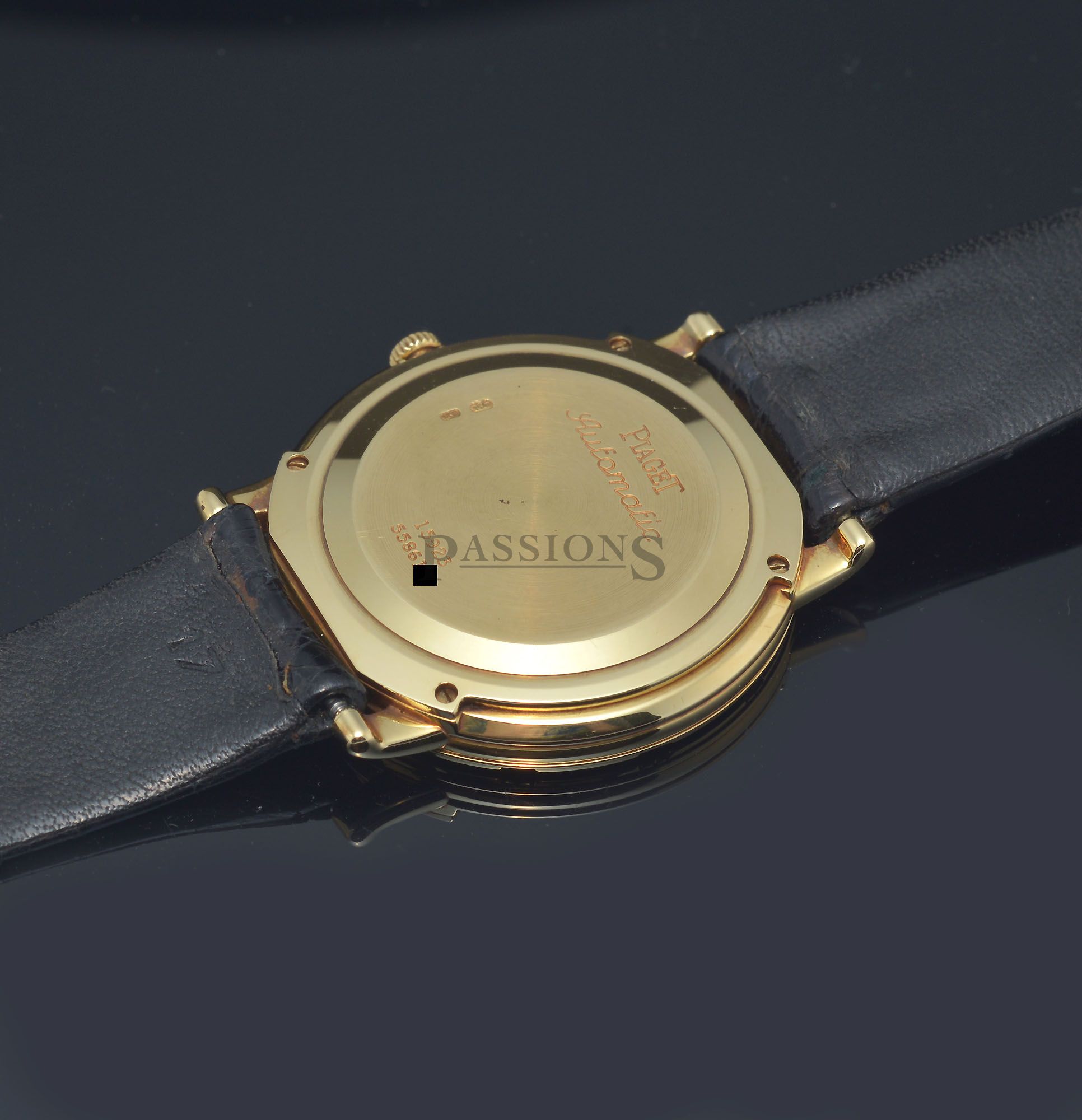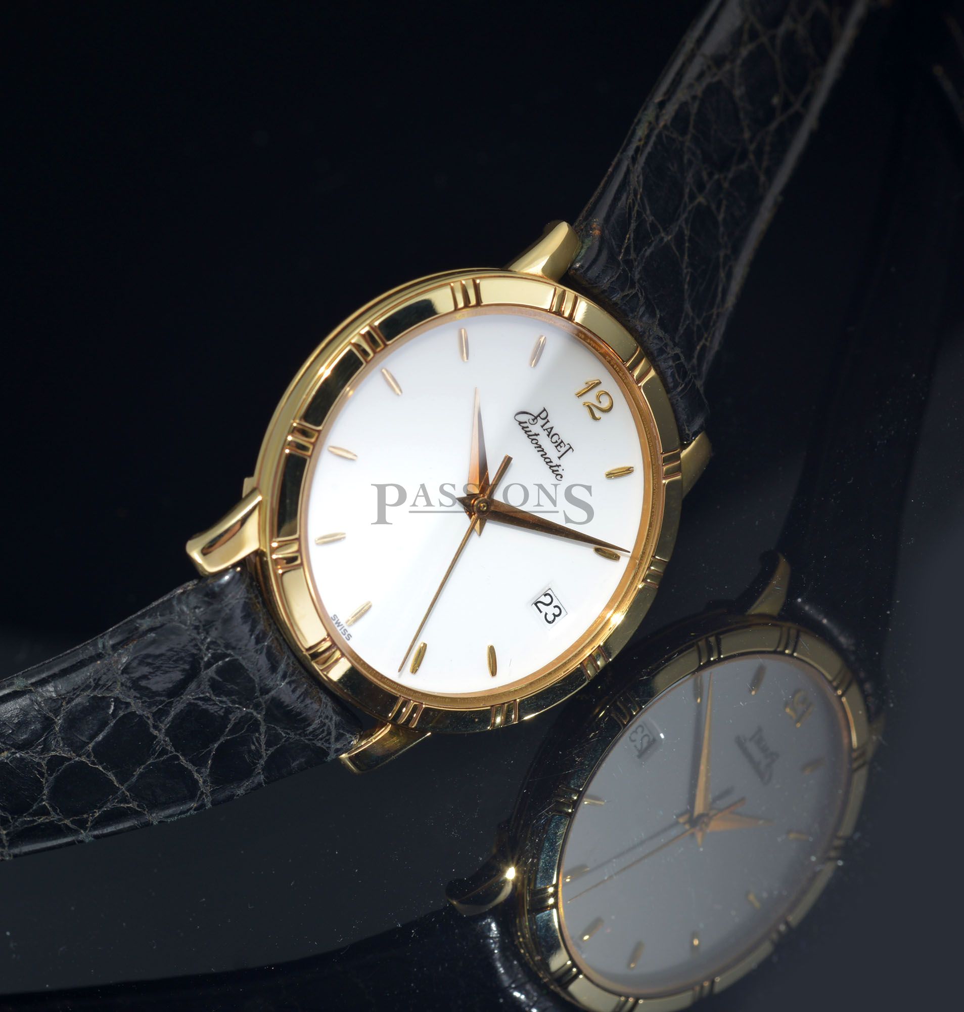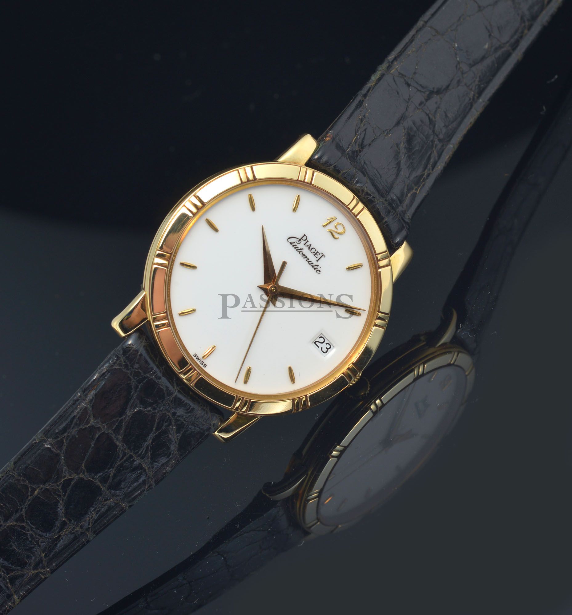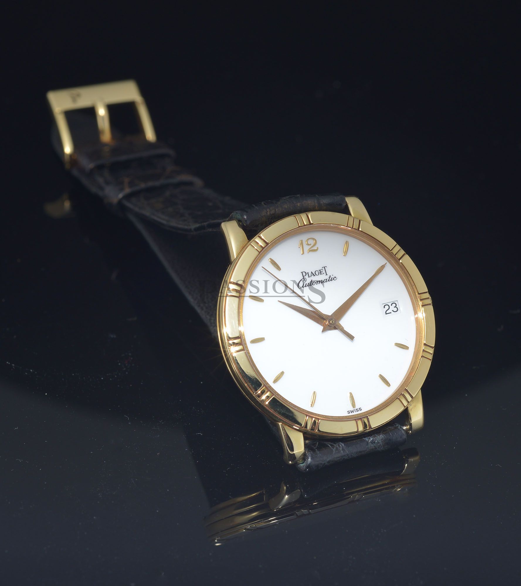 Here’s a beautiful solid 18ct gold automatic watch with a date. Made by Piaget in the late 1990s under Ref.GOA 15923 & named Dancer. It has a white enamel painted dial and gold appliqué batons & an Arabic 12.