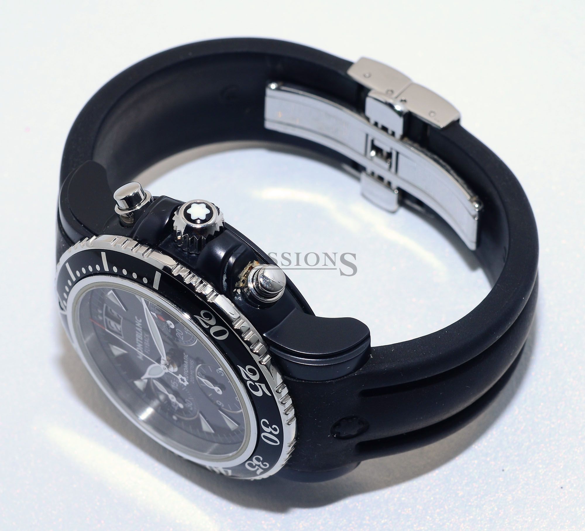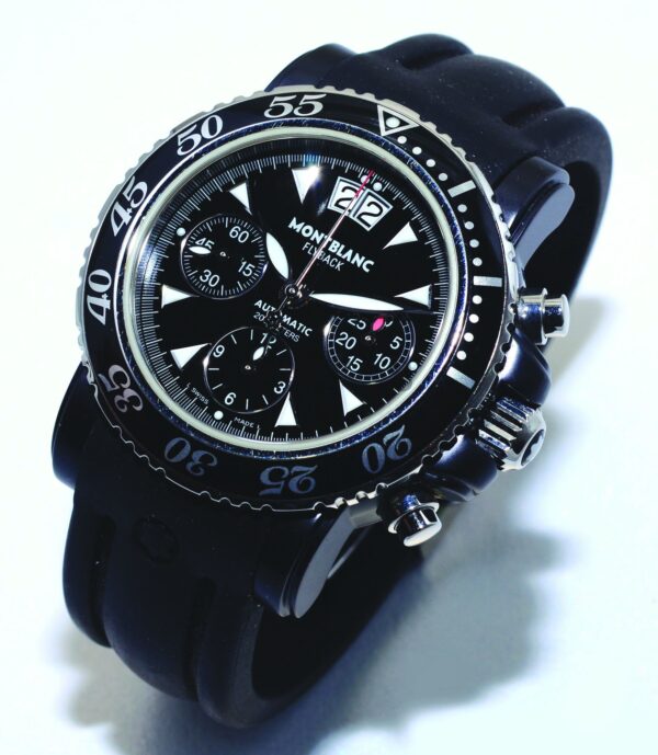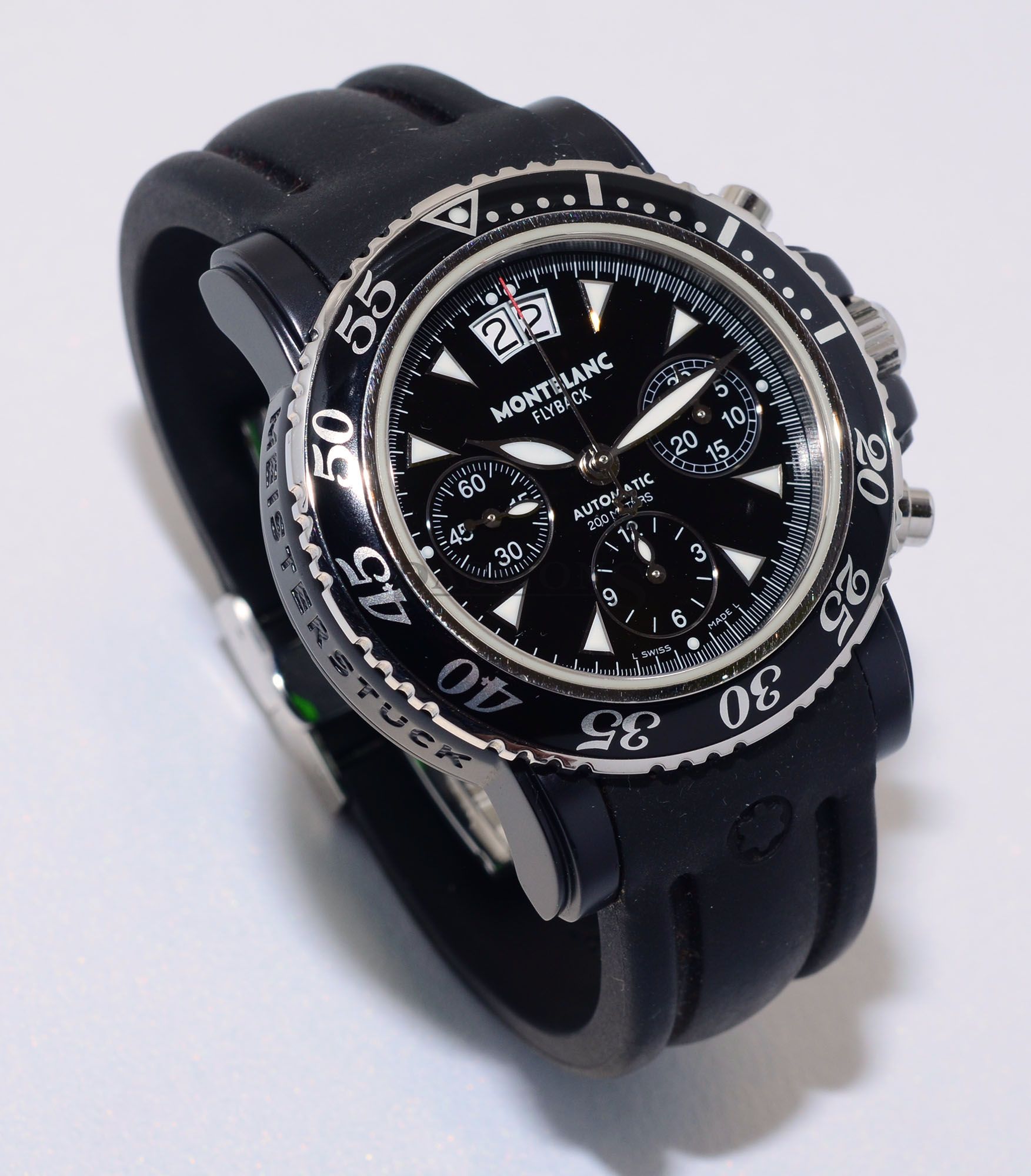 One owner’s watch purchased new from Sincere Watch in Singapore. This Mont Blanc Sport Flyback Chronograph is a discontinued model and offers a big-date feature which is a very desirable feature to have. The movement was overhauled in 2020. Watch is in splendid condition with little wear and tear, all functions checked and runs well. The matt black case is mint throughout except for a faint dent to the edge of the lug at 7 o’clock but otherwise nothing else to fault.