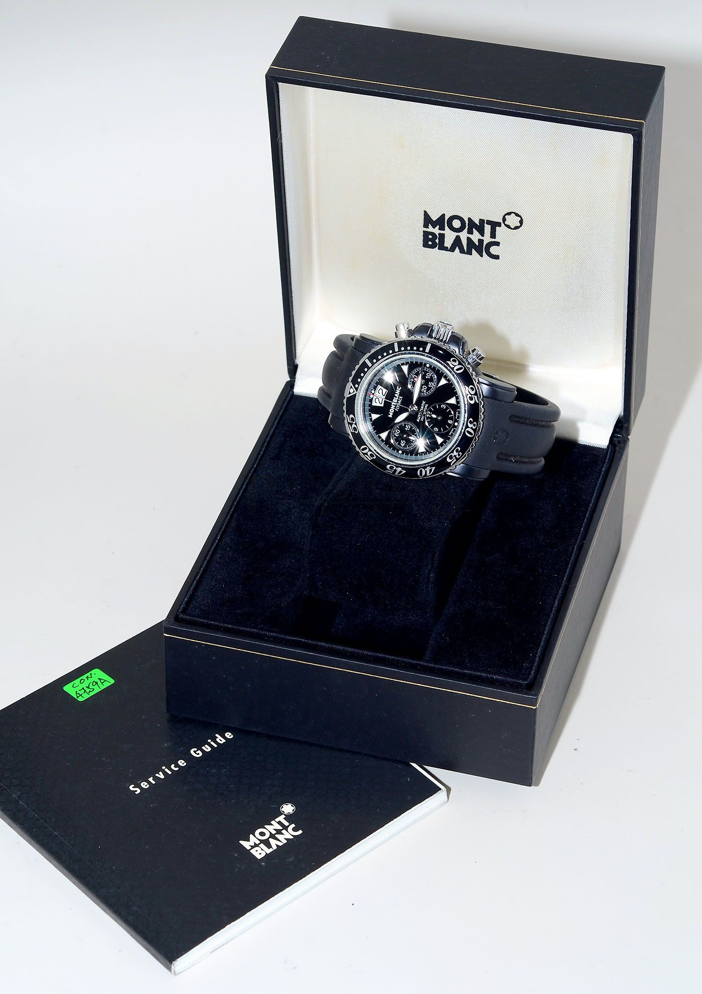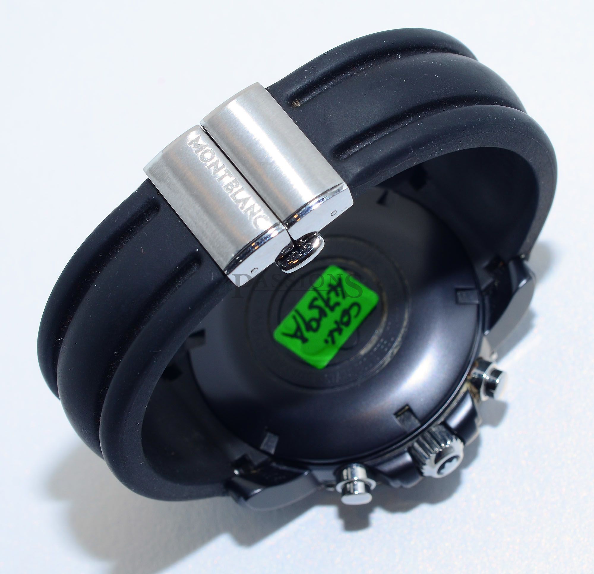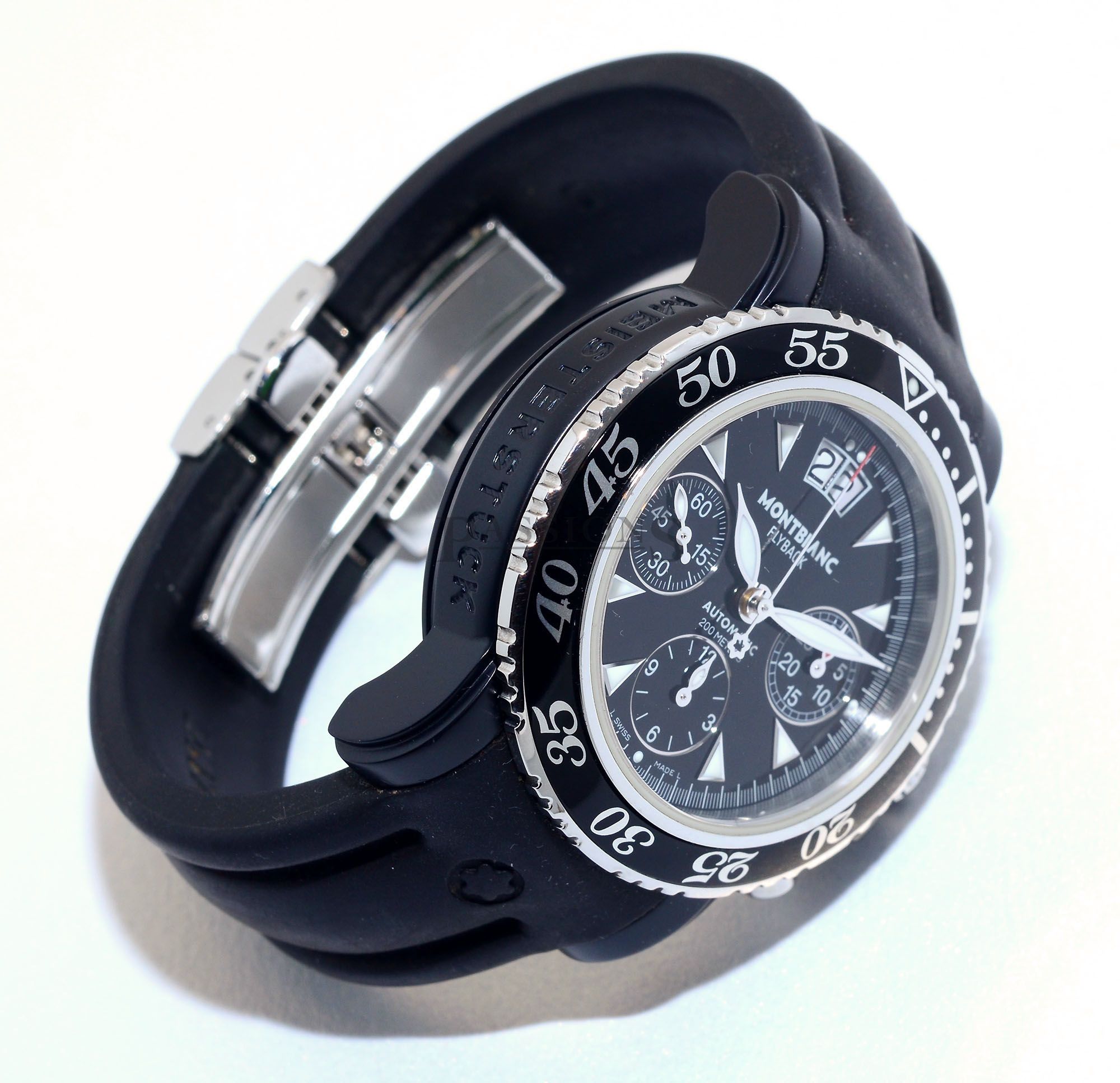 One owner’s watch purchased new from Sincere Watch in Singapore. This Mont Blanc Sport Flyback Chronograph is a discontinued model and offers a big-date feature which is a very desirable feature to have. The movement was overhauled in 2020. Watch is in splendid condition with little wear and tear, all functions checked and runs well. The matt black case is mint throughout except for a faint dent to the edge of the lug at 7 o’clock but otherwise nothing else to fault.