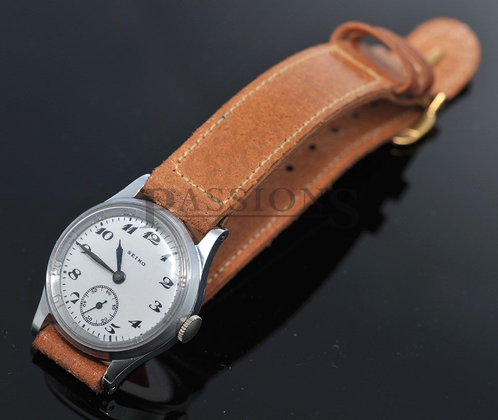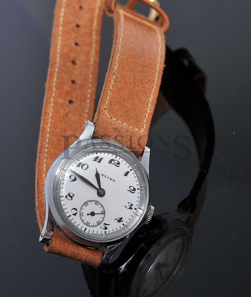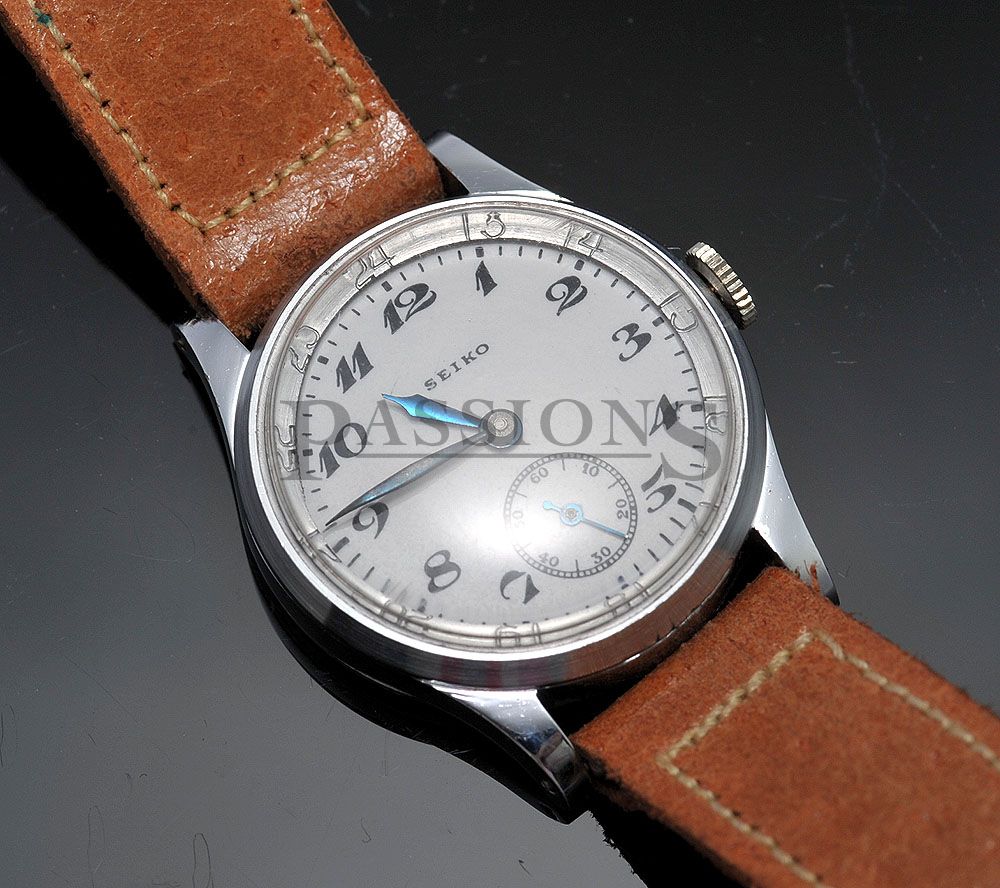 Vintage. No box/papers. This is a very rare & highly collectible timepiece made by Seikosha & signed Seiko, possibly for the Japanese military since it has the important 24hrs scale engraved onto the metal inner bezel. The oven baked white enamel dial is in pristine condition.