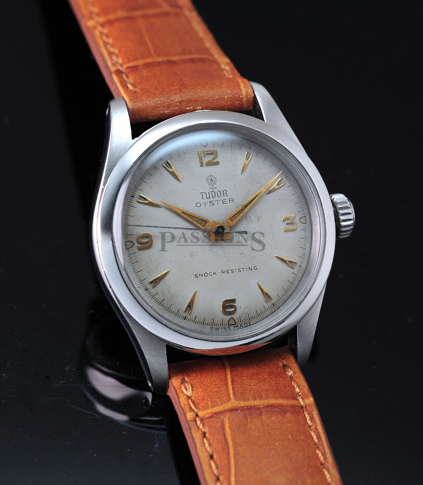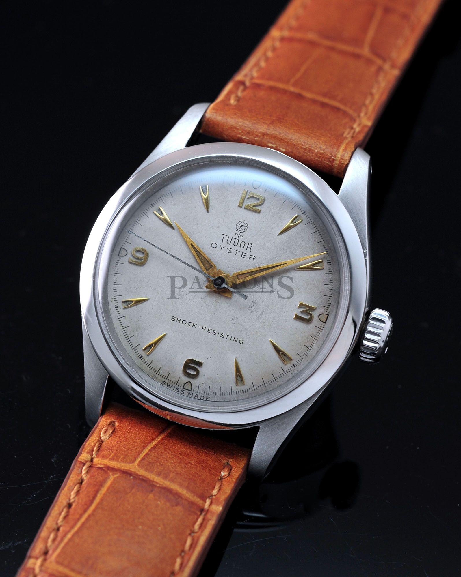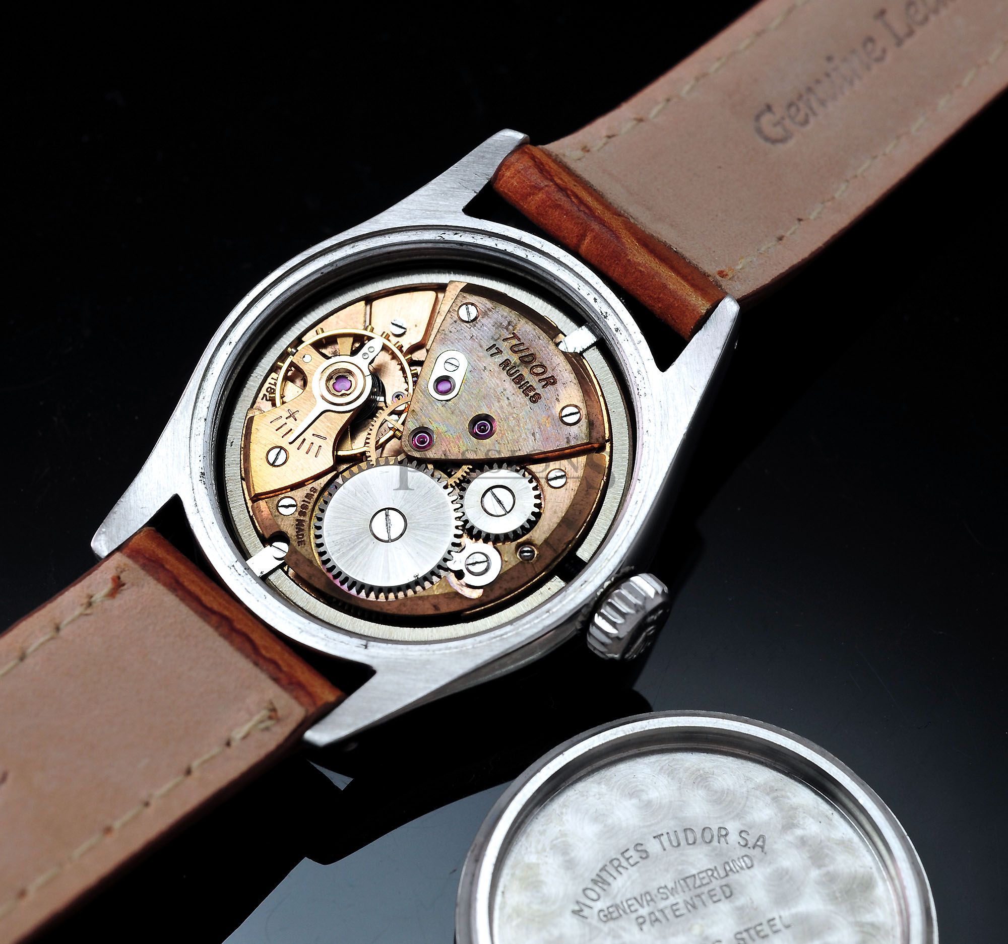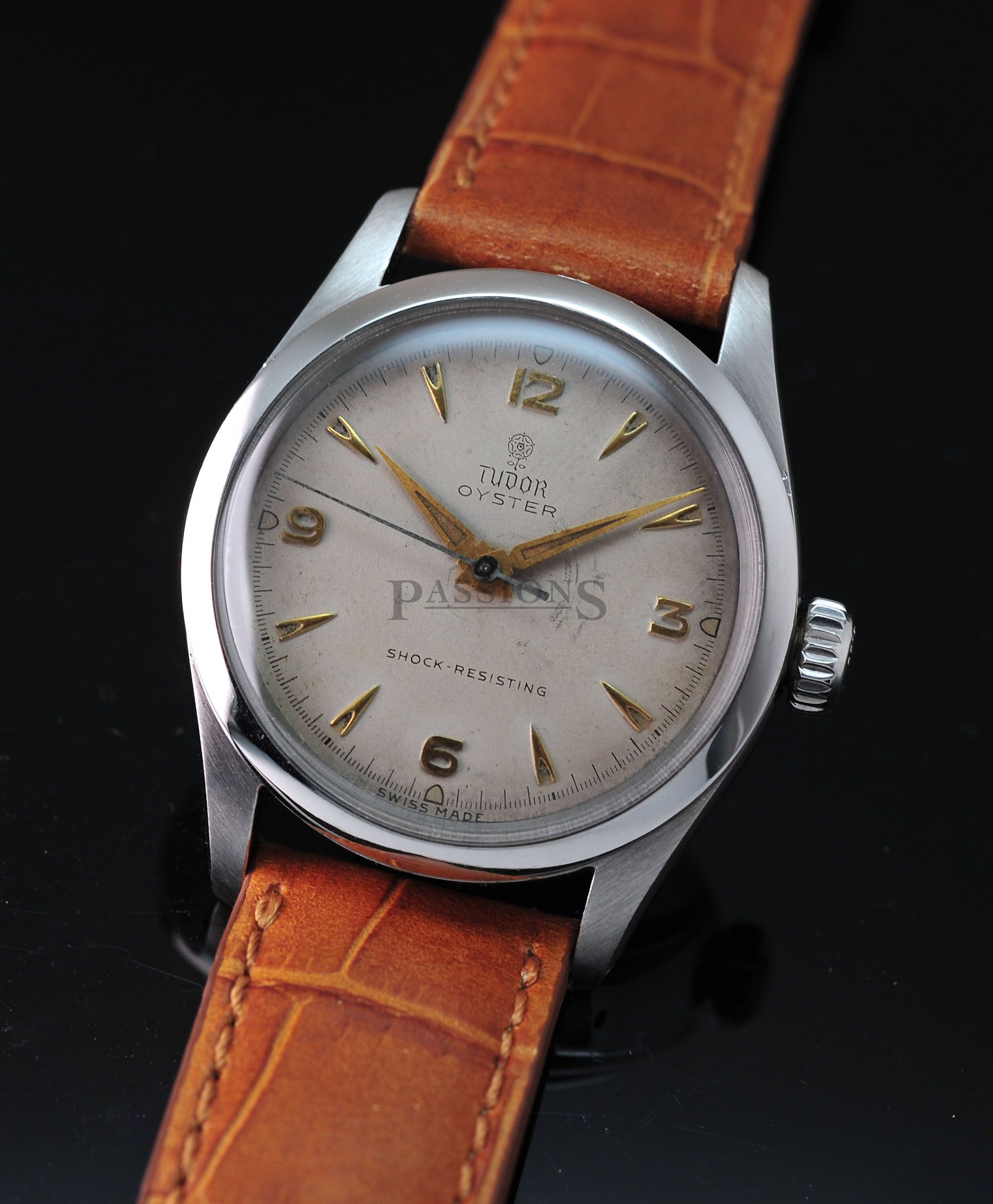 This is a very charming little Tudor Oyster dating back to early 1950s. The original dial has aged beautifully with a vignette look and punctuated by embossed gold Arabic numerals that filled the quarters like a Rolex Explorer. It is signed with the coveted Tudor rose in small logo. The case has been polished and remains thick throughout. The inner back cover is stamped Montres Tudor S.A.